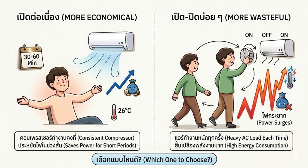 ทำไมการเปิด-ปิดบ่อยถึงเปลืองไฟ? ทุกครั้งที่เราเริ่มเปิดแอร์ คอมเพรสเซอร์ต้องทำงานหนักที่สุด (กินไฟสูงสุด) เพื่อดึงอุณหภูมิห้องที่ร้อนให้ลดลงมาตามค่าที่ตั้งไว้ หากเราปิดแอร์แล้วเปิดใหม่ภายในเวลาสั้นๆ แอร์จะต้องนับหนึ่งใหม่ในการทำความเย็น ซึ่งกระบวนการนี้แหละคือตัวการที่ทำให้ไฟกระชากและเปลืองพลังงาน