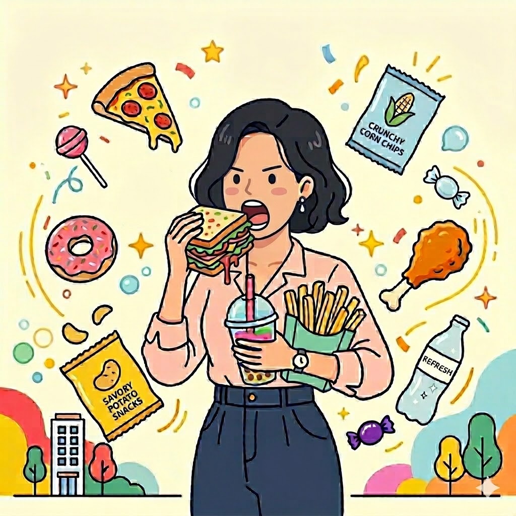 อาหารแปรรูป (บะหมี่กึ่งสำเร็จรูป ไส้กรอก แฮม อาหารกระป๋อง): ทำให้โซเดียมสูง → ความดันโลหิตสูง