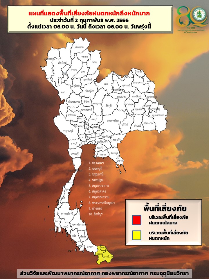 อนึ่ง ในช่วงวันที่ 2-7 ก.พ. 66 ลมตะวันออกเฉียงใต้พัดนำความชื้นจากทะเลจีนใต้ และอ่าวไทยเข้ามาปกคลุมภาคเหนือตอนล่าง ภาคตะวันออกเฉียงเหนือ ภาคกลางรวมทั้งกรุงเทพมหานครและปริมณฑล และภาคตะวันออก ประกอบกับมีลมฝ่ายตะวันตกในระดับบนเคลื่อนผ่านภาคเหนือ และภาคตะวันออกเฉียงเหนือตอนบน ลักษณะเช่นนี้ทำให้บริเวณดังกล่าวมีฝนฟ้าคะนองเกิดขึ้นได้