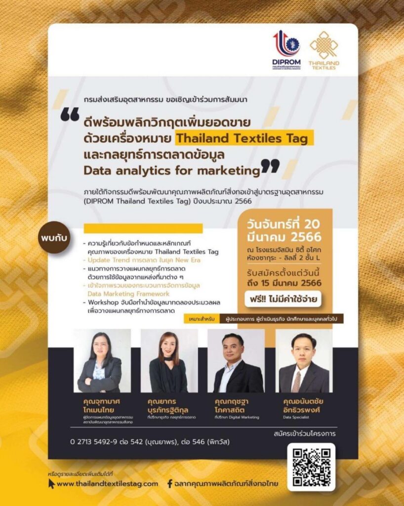 กรมส่งเสริมอุตสาหกรรม (DIPROM) “ดีพร้อม” กระทรวงอุตสาหกรรม โดยกองพัฒนาอุตสาหกรรมสร้างสรรค์ ขอเชิญชวนผู้ประกอบการอุตสาหกรมสิ่งทอ เครื่องนุ่งห่มและสินค้าแฟชั่นไลฟ์สไตล์ นักออกแบบ เจ้าของธุรกิจ เข้าร่วมสัมมนาฟรี “ดีพร้อมพลิกวิกฤตเพิ่มยอดขายด้วยเครื่องหมาย Thailand Textiles Tag” (ไทยแลนด์ เท็กซ์ไทล์ แท็ก) พร้อมเสริฟ์องค์ความรู้ด้านมาตรฐาน เครื่องหมายคุณภาพฉลากผลิตภัณฑ์สิ่งทอไทย การวางแผนกลยุทธ์ทางการตลาด การจัดการข้อมูล Data Marketing Framework (ดาต้า มาร์เก็ตติ้ง เฟรมเวิร์ค) รวมทั้งข้อมูลแนวโน้ม การตลาดในยุค Era (เอียร่า) และกิจกรรม Workshop (เวิร์คชอป) เข้มข้น ภายใต้โครงการกิจกรรม ดีพร้อมพัฒนาคุณภาพผลิตภัณฑ์สิ่งทอเข้าสู่มาตรฐานอุตสาหกรรม (DIPROM Thailand Textiles Tag) “ดีพร้อม ไทยแลนด์ เท็กซ์ไทล์ แท็ก” ในวันจันทร์ที่ 20 มีนาคม 2566 ที่ โรงแรมจัสมิน ซิตี้อโศก ห้องซากุระ – ลิลลี่ 2 ชั้น L (แอล)
