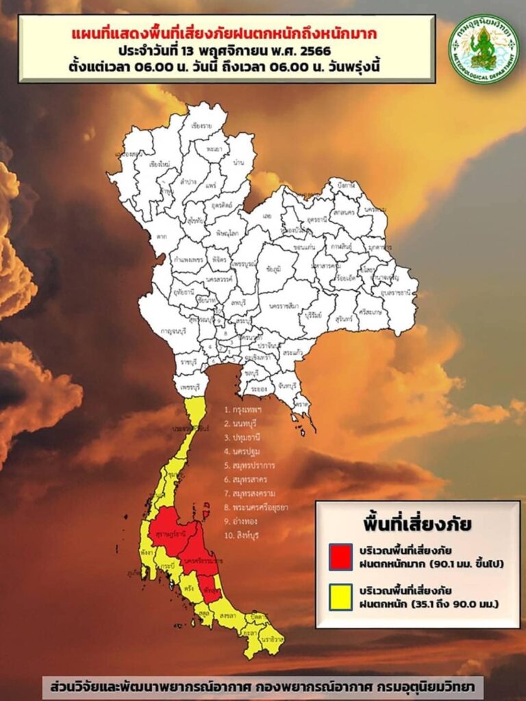 บริเวณความกดอากาศสูงหรือมวลอากาศเย็นกำลังปานกลางระลอกใหม่จากประเทศจีนแผ่ลงมาปกคลุมภาคตะวันออกเฉียงเหนือตอนบนแล้ว คาดว่าจะแผ่ปกคลุมภาคตะวันออกเฉียงเหนือตอนล่าง ภาคกลางตอนบน และภาคเหนือตอนบนในวันนี้ (13 พ.ย. 2566) ประกอบกับลมตะวันออกพัดปกคลุมบริเวณภาคตะวันออก ภาคกลางตอนล่าง และภาคใต้ ในขณะที่ย่อมความกดอากาศต่ำปกคลุมบริเวณภาคใต้ตอนล่าง
