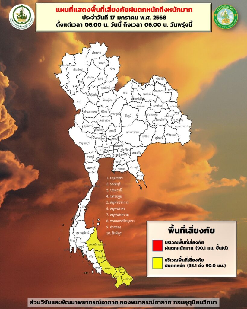 สำหรับมรสุมตะวันออกเฉียงเหนือที่พัดปกคลุมอ่าวไทย ภาคใต้ และทะเลอันดามันมีกำลังค่อนข้างแรง ทำให้ภาคใต้ตอนล่างมีฝนตกหนักบางแห่ง ส่วนคลื่นลมบริเวณอ่าวไทยและทะเลอันดามันมีกำลังค่อนข้างแรง โดยอ่าวไทยมีคลื่นสูง 2-3 เมตร บริเวณที่มีฝนฟ้าคะนองคลื่นสูงมากกว่า 3 เมตร ทะเลอันดามันมีคลื่นสูง 1-2 เมตร ห่างฝั่งคลื่นสูง 2-3 เมตร และบริเวณที่มีฝนฟ้าคะนองคลื่นสูงมากกว่า 2 เมตร ขอให้ประชาชนที่อาศัยอยู่บริเวณภาคใต้ฝั่งตะวันออกระวังอันตรายจากฝนตกหนักและฝนที่ตกสะสมซึ่งอาจทำให้เกิดน้ำท่วมฉับพลัน น้ำป่าไหลหลาก รวมทั้งระวังอันตรายจากคลื่นที่ซัดเข้าหาชายฝั่ง ส่วนชาวเรือควรเดินเรือด้วยความระมัดระวัง และหลีกเลี่ยงการเดินเรือในบริเวณที่มีฝนฟ้าคะนอง เรือเล็กบริเวณอ่าวไทยและทะเลอันดามันควรงดออกจากฝั่งจนถึงวันที่ 18 ม.ค. 68