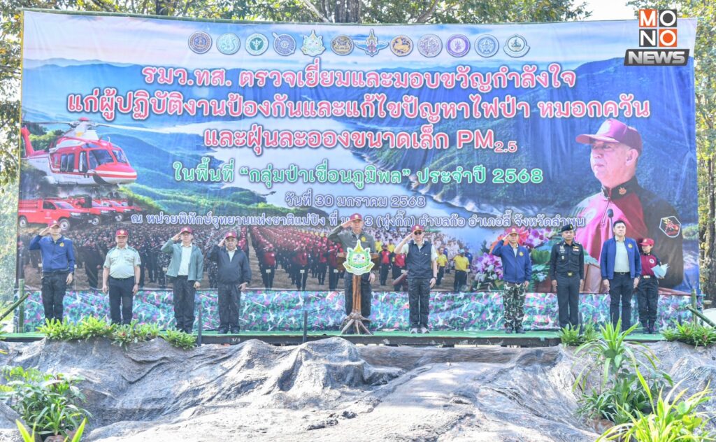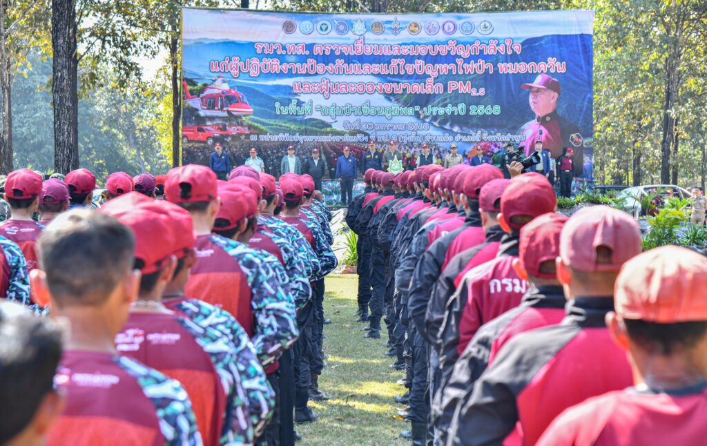 ดร.เฉลิมชัย กล่าวเสริมว่า นอกจากการเสริมกำลังของเจ้าหน้าที่แล้ว กำลังเสริมอีกส่วนที่สำคัญ คือ กำลังของเครือข่ายพี่น้องประชาชน กำนัน ผู้ใหญ่บ้าน ที่ต้องช่วยกันเฝ้าระวังป้องกันไม่ให้เกิดไฟป่าในพื้นที่หรือเกิดให้น้อยที่สุด ซึ่งในวันนี้เราได้มีการลงนามความมือกับชุมชนในพื้นที่รอบป่า เพื่อบูรณาการความร่วมมือในการแก้ไขปัญหาไฟป่า หมอกควัน และฝุ่นละอองขนาดเล็ก PM2.5 ผ่านกลไกการขับเคลื่อนในระดับท้องถิ่น เพื่อให้เกิดความร่วมมือระหว่างภาคประชาชน และหน่วยงานที่เกี่ยวข้องในการบริหารจัดการไฟป่าและหมอกควัน เพื่อแก้ไขปัญหามลพิษทางอากาศอย่างมีประสิทธิภาพ นำไปสู่การพัฒนาในมิติอื่น ๆ และเกิดการแก้ไขปัญหาอย่างยั่งยืน และรัฐบาลยังได้อนุมัติงบกลางในปี 2568 ทั้งในเรื่องวัสดุอุปกรณ์ การจ้างบุคลากรในการเข้ามาดูแลพื้นที่และปัญหาไฟป่า เพื่อเร่งแก้ไขปัญหาและรับมือกับสถานการณ์ของไฟป่าและหมอกควัน รวมถึงปัญหาฝุ่นละออง วันนี้ จึงขอความร่วมจากทุกฝ่ายให้ช่วยกันป้องกัน สอดส่อง ดูแล และเฝ้าระวังไม่ให้เกิดไฟป่าในพื้นที่ของพวกเราอย่างเต็มกำลังความสามารถต่อไป