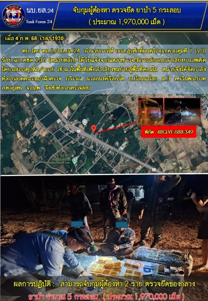 โดยวานนี้ (4 ก.พ.) เวลาประมาณ 20.00 น. กองกำลังสุรศักดิ์มนตรี ส่วนสกัดกั้นฯ ตอนบน/บก.ควบคุมที่ 1(ร.3) สนธิกำลังร่วมกับกองร้อยเฉพาะกิจตะเวนชายแดนที่ 236 (ร้อย.ฉก.ตชด.236 ) ได้รับแจ้งจากสายข่าว ว่ามีการซุกซ่อนยาเสพติด ในบริเวณพื้นที่ นวลอนงค์รีสอร์ท บ.นาโสก ม.3 ต.เวินพระบาท อ.ท่าอุเทน จ. นครพนม จึงได้ส่งชุดหน่วยข่าวกรอง กองกำลังสุรศักดิ์มนตรี (ขกท.กกล.สุรศักดิ์มนตรี) สนธิกำลังเข้าตรวจค้นพื้นที่ดังกล่าว จากการตรวจค้น สามารถจับกุมผู้ต้องหา จำนวน 2 คน (ชายไทย 1 คน, ชายสปป.ลาว 1 คน)
