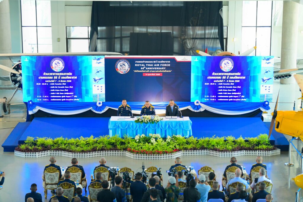 พล.อ.อ.พันธ์ภักดี พัฒนกุล ผู้บัญชาการทหารอากาศ แถลงข่าวจัดงานครบรอบ88ปีกองทัพอากาศ ระหว่าง 7-8 มีนาคม 2568 ณ กองบิน 6 ดอนเมือง โดยมี นางสาว แพทองธาร ชินวัตร นายกฯ เป็นประธาน พร้อมด้วย นายภูมิธรรม เวชยชัย รองนายกฯและ รัฐมนตรีว่าการกระทรวงกลาโหม ร่วมงาน