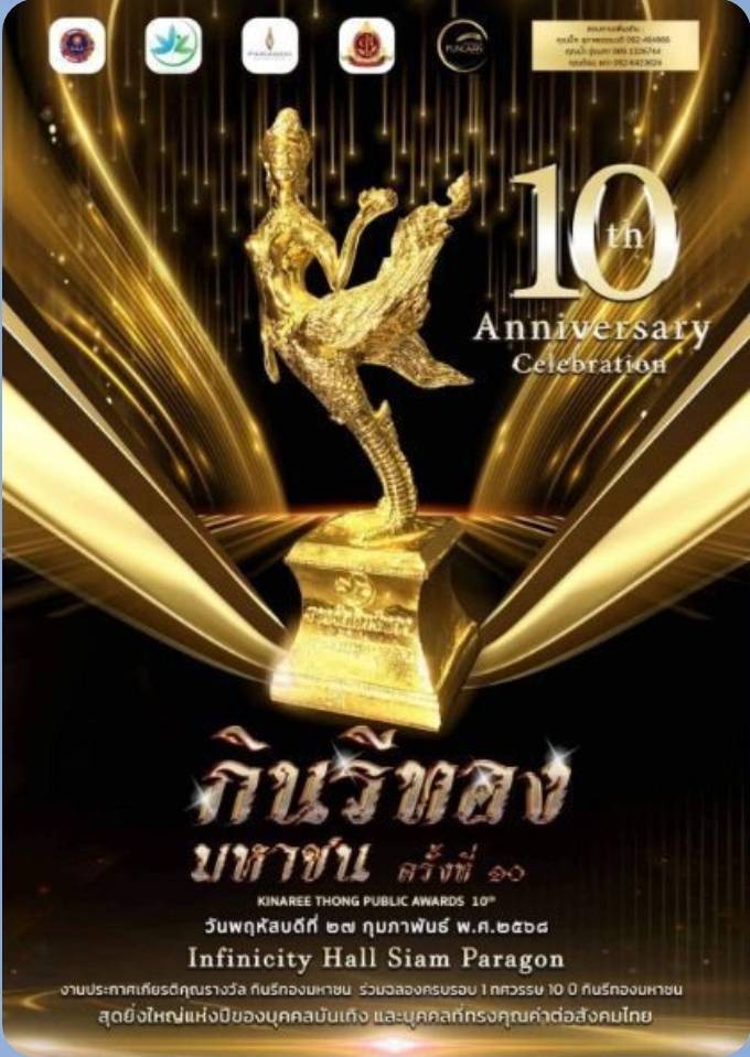 องค์กรส่งเสริมการศึกษาและวัฒนธรรมแห่งประเทศไทย ร่วมกับ ชมรมปันน้ำใจ อุ่นไอรัก จัดงานประกาศเกียรติคุณและรับโล่รางวัล “กินรีทอง มหาชน ครั้งที่ 10” อย่างยิ่งใหญ่ ณ NFINICITY HALL สยามพารากอน เพื่อเชิดชูบุคคลเบื้องหน้า เบื้องหลังและองค์กรที่มีบทบาทโดดเด่น สร้างคุณค่าและเป็นแบบอย่างที่ดีให้กับสังคมไทย