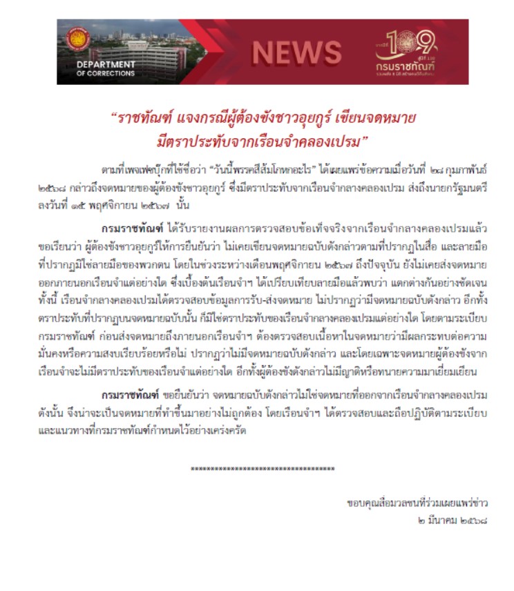 กรมราชทัณฑ์ ขอยืนยันว่า จดหมายฉบับดังกล่าวไม่ใช่จดหมายที่ออกจากเรือนจำกลางคลองเปรม ดังนั้น จึงน่าจะเป็นจดหมายที่ทำขึ้นมาอย่างไม่ถูกต้อง โดยเรือนจำฯ ได้ตรวจสอบและถือปฏิบัติตามระเบียบ และแนวทางที่กรมราชทัณฑ์กำหนดไว้อย่างเคร่งครัด