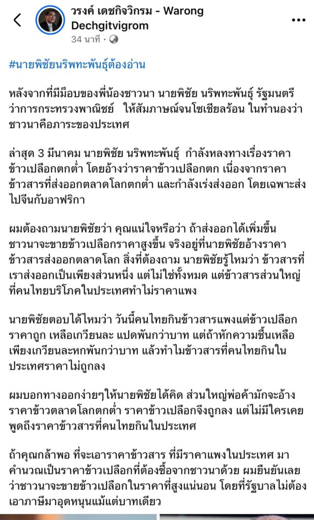 นพ.วรงค์ เดชกิจวิกรม ประธานพรรคไทยภักดี โพสต์ข้อความผ่านเฟซบุ๊กวิจารณ์แนวทางแก้ปัญหาราคาข้าวของนายพิชัย นริพทะพันธุ์ รัฐมนตรีว่าการกระทรวงพาณิชย์ โดยระบุว่า “#นายพิชัยนริพทะพันธุ์ต้องอ่าน” หลังจากมีการชุมนุมของกลุ่มชาวนาเรียกร้องให้รัฐบาลแก้ปัญหาราคาข้าวตกต่ำ