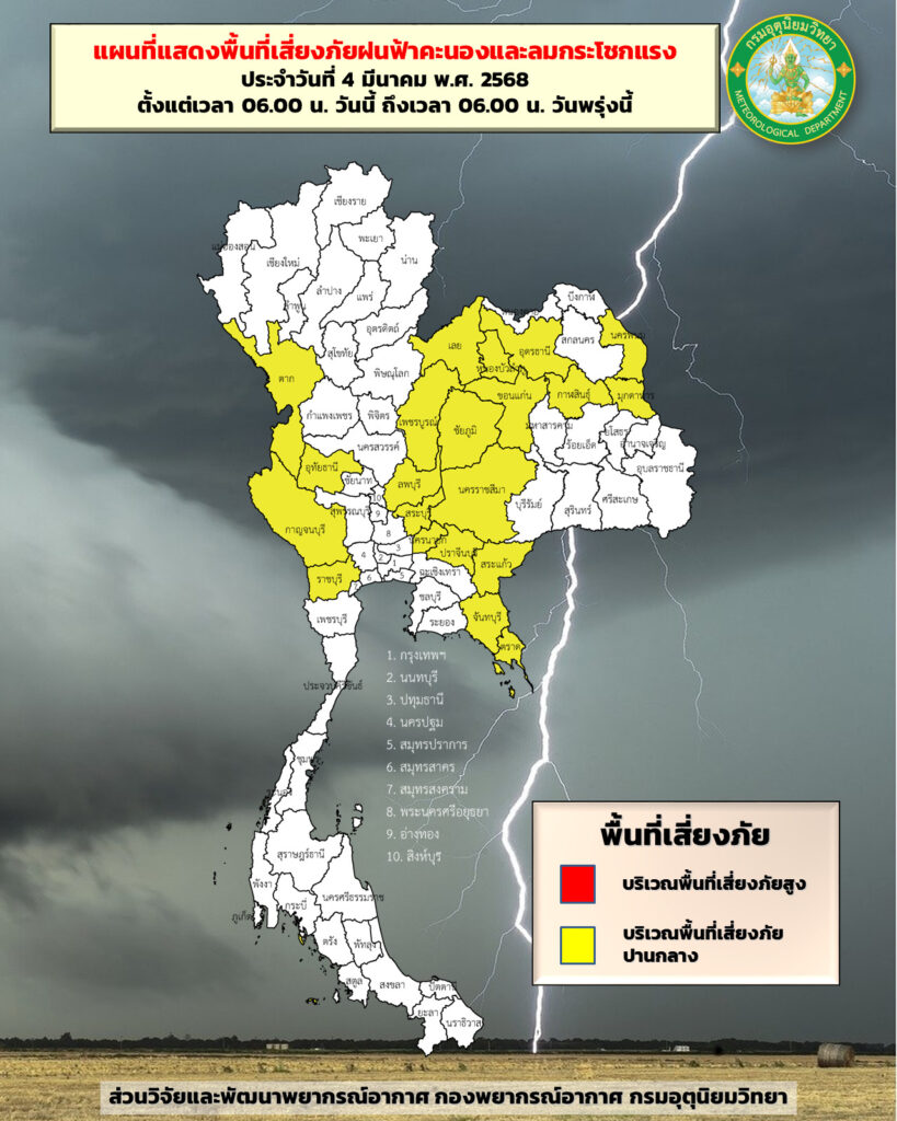อนึ่ง ในช่วงวันที่ 6 – 8 มี.ค. 68 บริเวณภาคเหนือ ภาคตะวันออกเฉียงเหนือ ภาคกลาง รวมทั้งกรุงเทพมหานคร และภาคตะวันออก จะมีพายุฤดูร้อนเกิดขึ้น โดยมีลักษณะของพายุฝนฟ้าคะนอง ลมกระโชกแรง และลูกเห็บตกบางแห่ง รวมถึงอาจมีฟ้าผ่าเกิดขึ้นได้บางพื้นที่ ทั้งนี้เนื่องจากบริเวณความกดอากาศสูงหรือมวลอากาศเย็นกำลังปานกลางจากประเทศจีนจะแผ่ลงมาปกคลุมภาคตะวันออกเฉียงเหนือและทะเลจีนใต้ ในขณะที่ประเทศไทยตอนบนมีอากาศร้อนถึงร้อนจัด