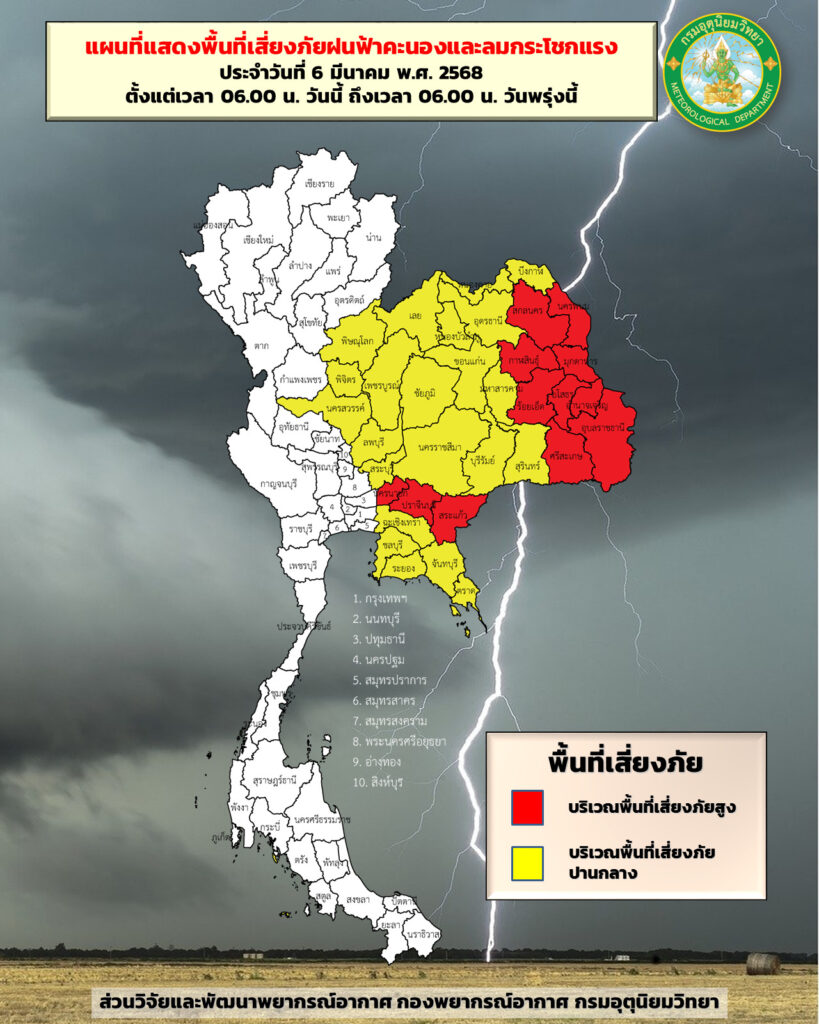 ทั้งนี้เนื่องจากบริเวณความกดอากาศสูงหรือมวลอากาศเย็นกำลังปานกลางที่ปกคลุมประเทศลาวตอนบนและประเทศเวียดนามตอนบนจะแผ่ลงมาปกคลุมภาคตะวันออกเฉียงเหนือและทะเลจีนใต้ในวันนี้ (6 มี.ค. 68) ในขณะที่ความกดอากาศต่ำเนื่องจากความร้อนปกคลุมประเทศไทยตอนบน ประกอบกับมีลมใต้และลมตะวันออกเฉียงใต้พัดปกคลุมบริเวณดังกล่าว