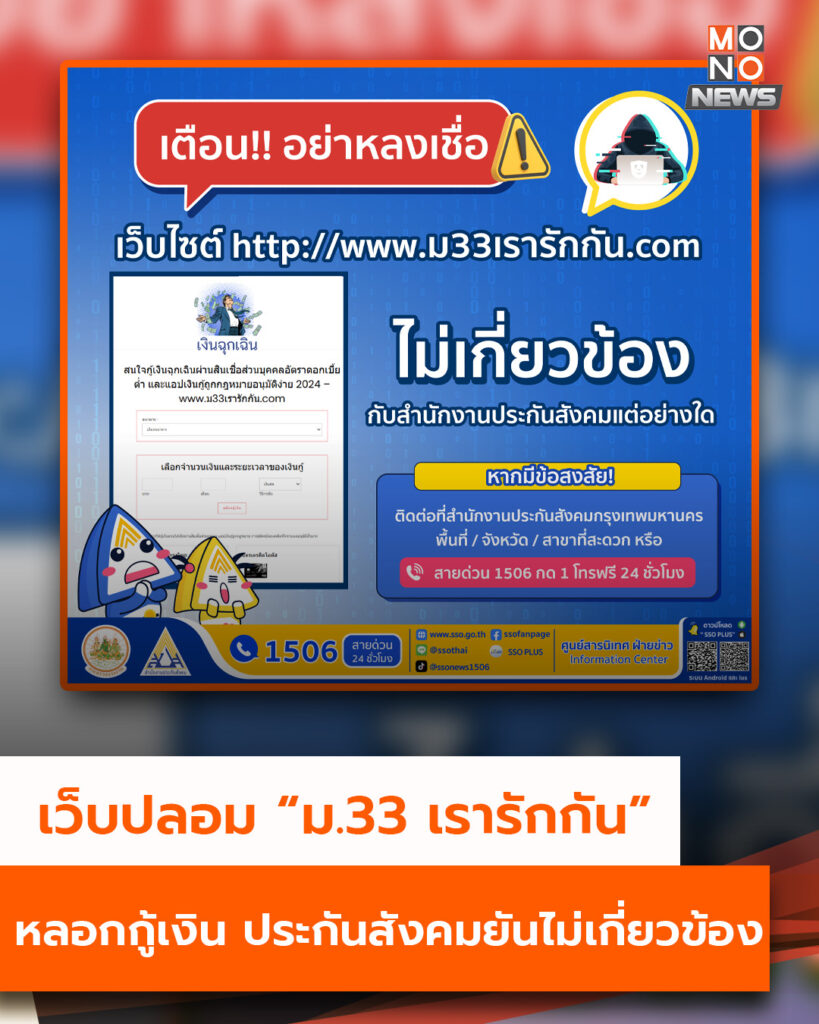 สำนักงานประกันสังคม ออกโรงเตือนประชาชนเกี่ยวกับ เว็บไซต์ปลอมที่แอบอ้างชื่อโครงการ “ม.33 เรารักกัน” หลอกให้ผู้ประกันตนกู้เงินฉุกเฉิน ยืนยันไม่มีส่วนเกี่ยวข้อง และโครงการดังกล่าวสิ้นสุดไปตั้งแต่ปี 2565