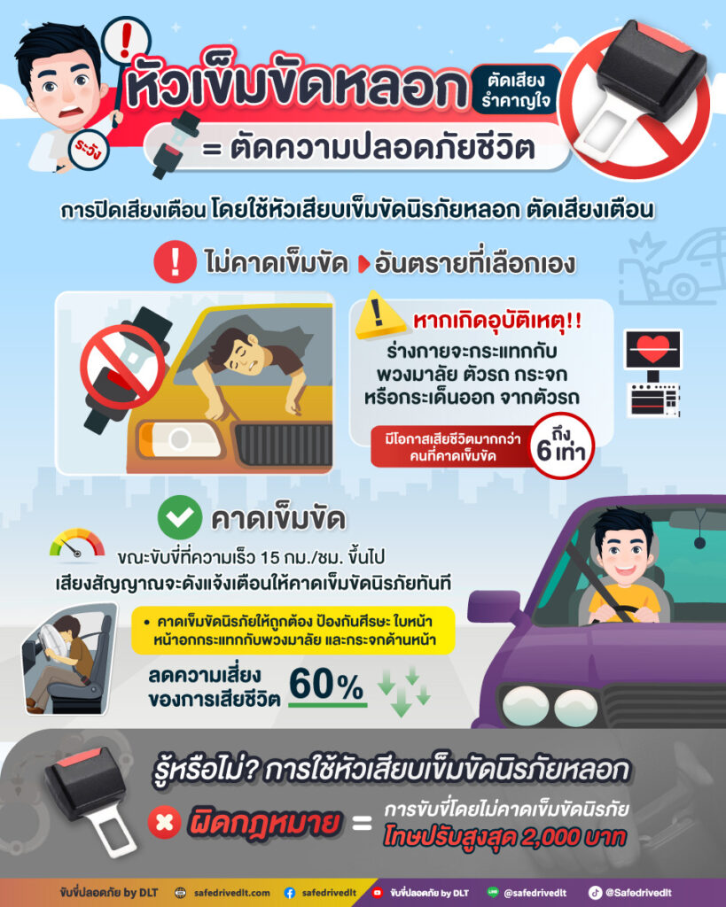 ล่าสุด ทางกรมการขนส่งทางบก ได้ออกมากเตือนว่า การไม่คาดเข็มขัดนิรภัยและใช้อุปกรณ์หลอกว่าใส่เข็มขัดขณะขับรถนั้น “อันตรายมาก” หากเกิดอุบัติเหตุร่างกายจะกระแทกกับพวงมาลัย , ตัวรถ , กระจก หรือกระเด็นออกจากตัวรถ ซึ่งมีโอกาสเสียชีวิตมากกว่าคนที่คาดเข็มขัดนิรภัย ถึง 6 เท่า สำหรับการคาดเข็มขัดนิรภัยขณะขับรถที่ถูกต้อง จะช่วยป้องกันศีรษะ , ใบหน้า , หน้าอก กระแทกกับพวงมาลัย และกระจกด้านหน้า ลดความเสี่ยงของการเสียชีวิตถึง 60%