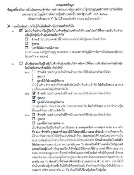 รวมถึง พ.ร.บ.การจัดการหุ้นฯ ที่กำหนดให้รัฐมนตรีต้องโอนหุ้นหรือแจ้งต่อ ป.ป.ช. หากมีการกรอกข้อมูลไม่ครบถ้วนหรือปกปิดข้อเท็จจริง อาจถือเป็นการให้ข้อมูลเท็จต่อสำนักเลขาธิการคณะรัฐมนตรี และส่งผลต่อความถูกต้องในการแต่งตั้งรัฐมนตรี