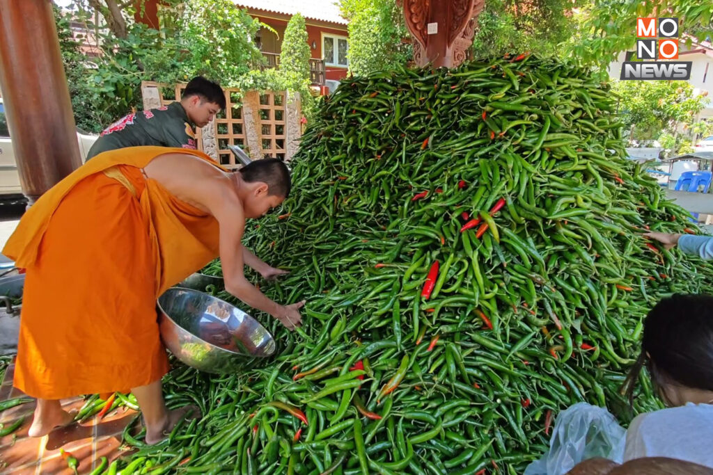 พริกสดกว่า 8 ตันที่นำมาแจกจ่าย เป็นผลผลิตจากชาวสวนในอำเภออมก๋อย จ.เชียงใหม่ ที่ขณะนี้ต้องประสบปัญหาราคาตกต่ำ ราคาหน้าสวนเหลือเพียงกิโลกรัมละ 5 บาท ทำให้ชาวสวนจำนวนมากตัดใจปล่อยยืนต้นตายเพราะไม่คุ้มทุนค่าขนส่งในการจำหน่าย ปัญหาที่เกิดขึ้นทำให้พระพระครูอ๊อด วัดเจดีย์หลวง จังหวัดเชียงใหม่ ตัดสินใจระดมทุนช่วยซื้อผลผลิตจากชาวสวนในราคาที่เป็นธรรม เพื่อช่วยเหลือเกษตรกรให้ผ่านพ้นวิกฤต ซึ่งผลผลิตทั้งหมดถูกขนลงดอยมาแจกจ่ายให้กับประชาชนหลายจุดใน จ.เชียงใหม่ และ จ.ลำพูน ซึ่งเป็นการช่วยเหลือเกษตรกรและช่วยเหลือลดค่าใช้จ่ายให้กับประชาชนไปพร้อมกัน
