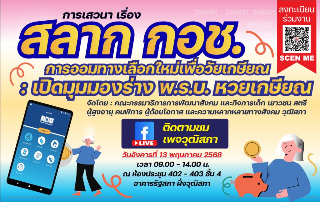 ทั้งนี้ เมื่อวันที่ 28 เมษายน 2568 ที่ผ่านมา คณะกรรมาธิการฯ ได้พิจารณาศึกษาร่าง พ.ร.บ.ดังกล่าว โดยเชิญหน่วยงานหลักที่เกี่ยวข้องเข้าร่วมประชุมเพื่อแลกเปลี่ยนข้อมูลและข้อเสนอแนะต่อร่างพระราชบัญญัติฉบับนี้ ได้แก่ กองทุนการออมแห่งชาติ กระทรวงการคลัง สำนักงานคณะกรรมการกฤษฎีกา สำนักงานสภาพัฒนาการเศรษฐกิจและสังคมแห่งชาติ ซึ่งผลการหารือร่วมกันมีข้อเสนอที่น่าสนใจ อาทิ ข้อห่วงใยด้านผลกระทบต่อกลุ่มเปราะบางและความเข้าใจที่อาจคลาดเคลื่อนเกี่ยวกับการออมในลักษณะหวยเกษียณ ข้อเสนอให้กำหนดผลตอบแทนที่ชัดเจนเพื่อสร้างแรงจูงใจในการเข้าร่วม การศึกษาผลกระทบจากอัตราเงินเฟ้อและความมั่นคงของระบบกองทุนในระยะยาว การประชาสัมพันธ์เชิงรุกเพื่อให้ประชาชนทุกกลุ่มเข้าใจแนวทางนี้อย่างแท้จริง และการกำหนดเป้าหมายสมาชิกและวางแผนเชิงรุกเพื่อให้การดำเนินงานเกิดผลเป็นรูปธรรม ดังนั้น เพื่อให้ได้รับข้อมูลที่ครบถ้วนรอบด้านและเป็นการเปิดเวทีให้ประชาชนได้ร่วมแสดงความเห็นอย่างกว้างขวาง คณะกรรมาธิการฯ จึงได้กำหนดจัดเสวนาเรื่อง “สลาก กอช. การออมทางเลือกใหม่เพื่อวัยเกษียณ : เปิดมุมมองร่าง พ.ร.บ. หวยเกษียณ” ในวันที่ 13 พฤษภาคม 2568 เวลา 09.00 – 14.00 นาฬิกา ณ ห้องประชุม