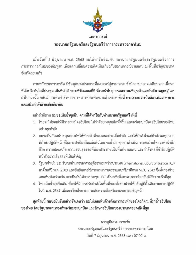 เช้าวันนี้ (7 มิ.ย. 68) สำนักงานโฆษกกระทรวงกลาโหมได้เผยแพร่แถลงการณืของ นายภูมิธรรม เวชยชัย รองนายกรัฐมนตรีและรัฐมนตรีว่าการกระทรวงกลาโหม โดยแถลงการดังกล่าวได้ย้ำจุดยืน 4 ข้อ มีรายละเอียดดังนี้