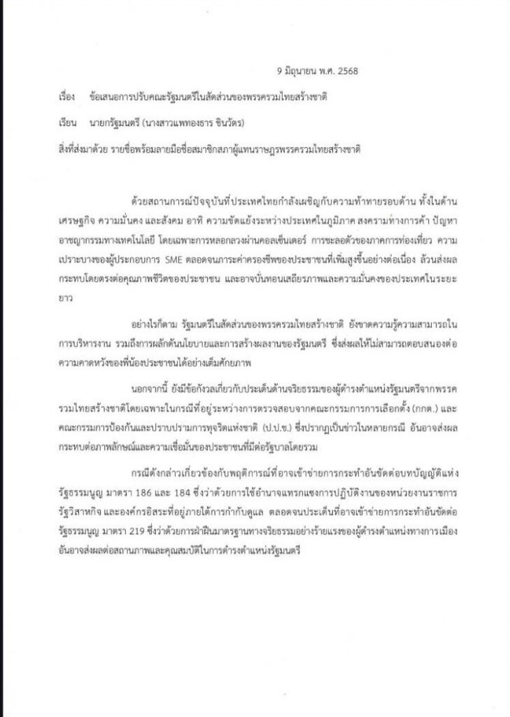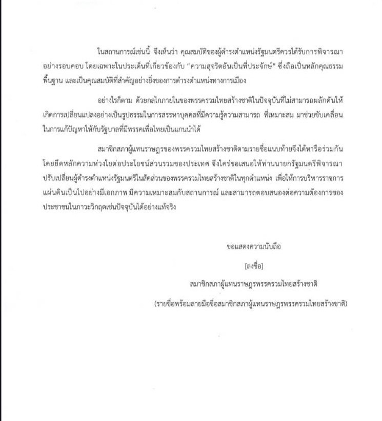สส.พรรครวมไทยสร้างชาติ ตามรายชื่อแนบท้าย จึงได้หารือร่วมกัน โดยยึดหลักความห่วงใยต่อประโยชน์ส่วนรวมของประเทศ จึงใคร่ขอเสนอให้ท่านนายกรัฐมนตรีพิจารณา ปรับเปลี่ยนผู้ดำรงตำแหน่งรัฐมนตรีในสัดส่วนของพรรพรรครวมไทยสร้างชาติในทุกตำแหน่ง เพื่อให้การบริหารราชการแผ่นดินเป็นไปอย่างมีเอกภาพ มีความแหมาะสมกับสถานการณ์ และสามารถตอบสนองต่อความต้องการของประชาชนในภาวะวิกฤตเช่นปัจจุบันได้อย่างแท้จริง