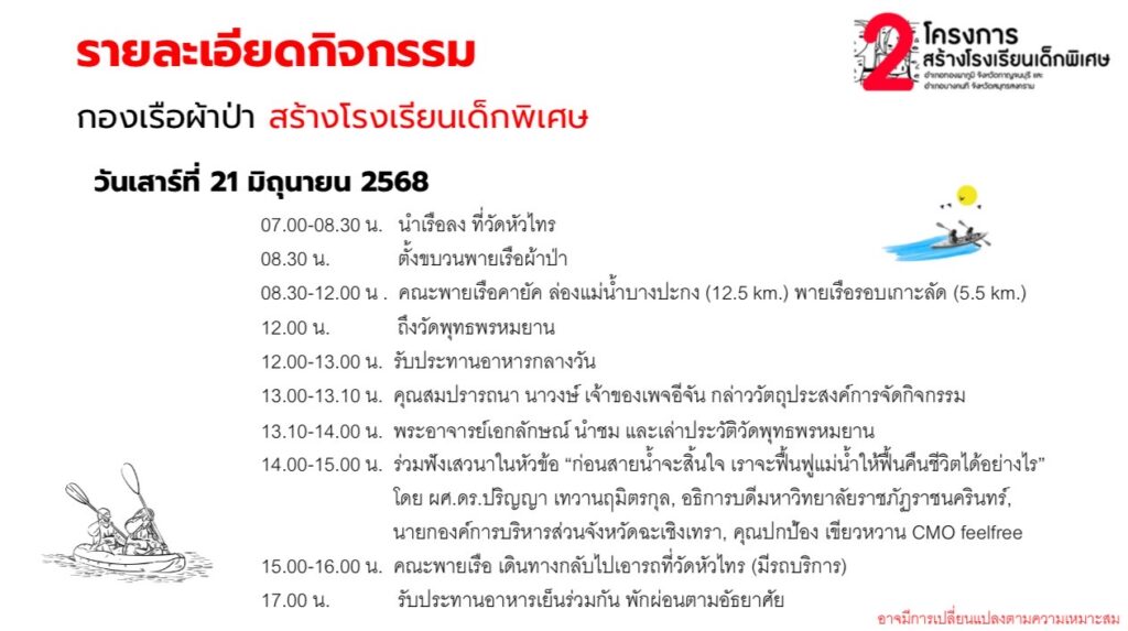 ขอเชิญร่วมบุญ “กองเรือผ้าป่า” สร้างโรงเรียนเด็กพิเศษทองผาภูมิให้น้องๆ ได้มีที่เรียน ซึ่งจะจัดขึ้นในวันที่ 21-22 มิถุนายน 2568 ณ วัดพุทธพรหมยาน จังหวัดฉะเชิงเทรา โดยจะมีเรือคายัคและเรืออื่นๆ มาร่วมขบวนแห่กองบุญผ้าป่า มากกว่า 100 ลำ ล่องแม่น้ำบางปะกง มุ่งสู่วัดพุทธพรหมยาน จังหวัดฉะเชิงเทรา เพื่อนำผ้าป่าไปทอดถวายพระอาจารย์เอกลักษณ์ ปญฺญาคโม แห่งวัดพุทธพรหมยาน สมทบทุนสร้างโรงเรียนเด็กพิเศษ