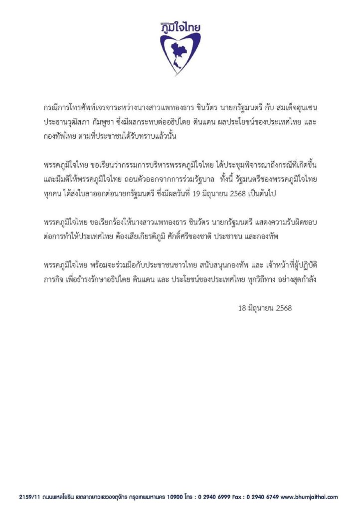 วันที่ 18 มิถุนายน 2568 เมื่อเวลา 20.40 น. “พรรคภูมิใจไทย” ออกแถลงการณ์ กรณีการโทรศัพท์เจรจาระหว่างนางสาวแพทองธาร ชินวัตร นายกรัฐมนตรี กับ สมเด็จฮุนเซน ประธานวุฒิสภา กัมพูชา ซึ่งมีผลกระทบต่ออธิปไตยดินแดน ผลประโยชน์ของประเทศไทย และกองทัพไทย ตามที่ประชาชนได้รับทราบแล้วนั้น พรรคภูมิใจไทย ขอเรียนว่ากรรมการบริหารพรรคภูมิใจไทย ได้ประชุมพิจารณาถึงกรณีที่เกิดขึ้นและมีมติให้พรรคภูมิใจไทย ถอนตัวออกจากการร่วมรัฐบาล