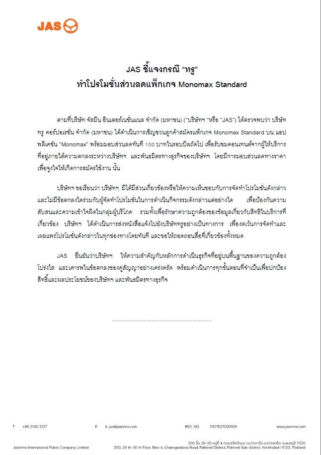 บริษัท จัสมิน อินเตอร์เนชั่นแนล จำกัด (มหาชน) ได้ออกหนังสือชึ้แจงกรณีที่มีการพบว่า บริษัททรู คอร์ปอเรชั่น จำกัด (มหาชน) ได้มีการเชิญชวนลูกค้าสมัครแพ็คเกจ Monomax Standard บนแอปฯ Monomax พร้อมกับมอบส่วนลดให้ 100 บาท ในรอบบิลถัดไป เพื่อรับชมเนื้อหาจากผู้ให้บริการ