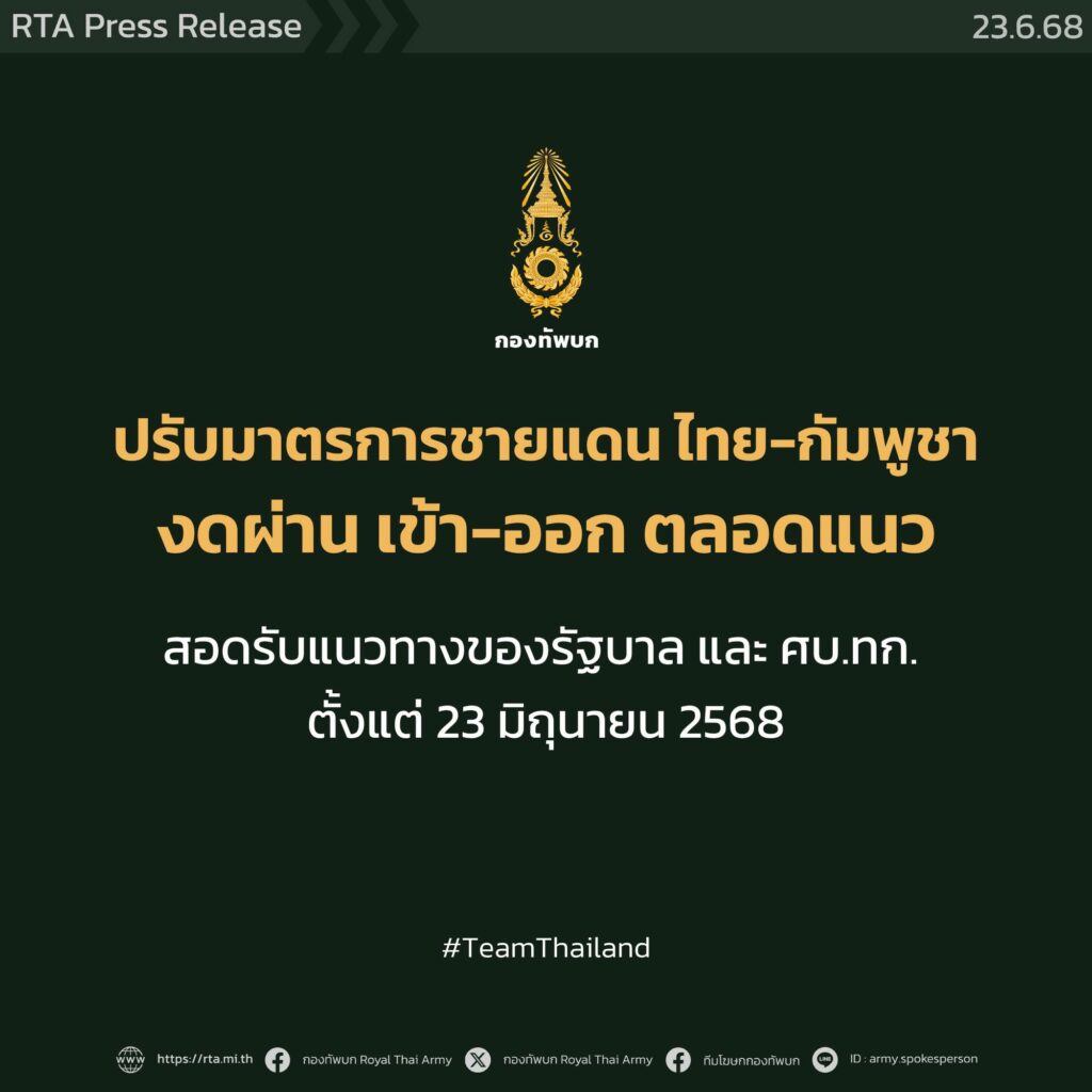 ตามที่กองกำลังป้องกันชายแดนของกองทัพบก ได้กำหนดมาตรการควบคุมการเปิด-ปิดจุดผ่านแดนทุกประเภทตลอดแนวชายแดนไทย-กัมพูชา เพื่อรักษาอธิปไตยของชาติ และดูแลความปลอดภัยของประชาชน ตามความเหมาะสมกับสถานการณ์ด้านความมั่นคงในพื้นที่ ตั้งแต่วันที่ 7 มิ.ย. 68 ที่ผ่านมานั้น