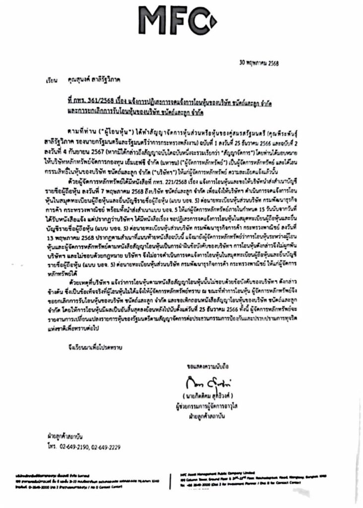 เอกสารภายในจากบริษัทหลักทรัพย์จัดการกองทุนเอ็มเอฟซี (MFC) ระบุว่า นางสุนงค์ สาลีรัฐวิภาค ภรรยานายพีระพันธุ์ สาลีรัฐวิภาค รองนายกรัฐมนตรีและรัฐมนตรีว่าการกระทรวงพลังงาน ไม่สามารถโอนหุ้นในบริษัท ชนัตถ์และลูก จำกัด ได้สำเร็จ แม้มีสัญญาแต่งตั้ง MFC เป็นผู้จัดการดูแลหุ้นตั้งแต่ปลายปี 2566 และต้นปี 2567 แต่ภายหลังบริษัทชนัตถ์ฯ ปฏิเสธการโอน เนื่องจากผิดข้อบังคับบริษัทที่ไม่อนุญาตให้โอนหุ้นแก่บุคคลภายนอก จนนำไปสู่การยกเลิกสัญญาทั้งหมดโดย MFC เมื่อ 30 พ.ค. 2568