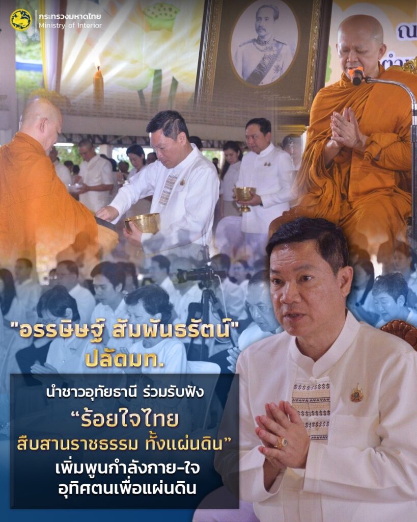 วันนี้ (27 มิ.ย. 68) เวลา 07.00 น. นายอรรษิษฐ์ สัมพันธรัตน์ ปลัดกระทรวงมหาดไทย เป็นประธานพิธีตักบาตรและบรรยายธรรม “โครงการร้อยใจไทย สืบสานราชธรรม ทั้งแผ่นดิน” ถวายเป็นพระราชกุศลแด่พระบาทสมเด็จพระเจ้าอยู่หัว เพื่อเฉลิมพระเกียรติเนื่องในโอกาสมหามงคลเฉลิมพระชนมพรรษา 6 รอบ 72 พรรษา ณ อาคารสวนน้ำเฉลิมพระเกียรติฯ (บึงพระชนก) ต.เกาะเทโพ อ.เมืองอุทัยธานี จ.อุทัยธานี โดยได้รับเมตตาจากพระราชวัชรสุทธิวงศ์ (เจ้าคุณอารยวังโส) เจ้าอาวาสวัดป่าพุทธพจน์หริภุญไชย (ธ) ในพระราชูปถัมภ์ฯ เป็นประธานสงฆ์ บรรยายธรรมบูชาคุณพระรัตนตรัยและประกาศราชธรรม พร้อมด้วยพระสงฆ์ 10 รูป