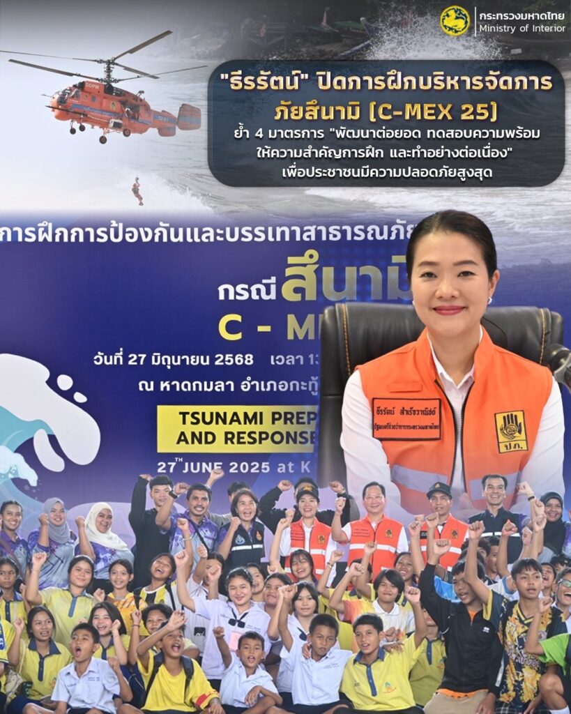 วันนี้ (27 มิ.ย. 68) เวลา 14.00 น. น.ส.ธีรรัตน์ สำเร็จวาณิชย์ รัฐมนตรีช่วยว่าการกระทรวงมหาดไทย รักษาราชการแทนรัฐมนตรีว่าการกระทรวงมหาดไทย เป็นประธานตรวจเยี่ยมกำลังพลและภาคีเครือข่าย เเละปิดการฝึกการบริหารวิฤตการณ์ระดับชาติด้านสาธารณภัย ประจำปี พ.ศ. 2568 (Crisis Management Exercise: C-MEX 25) จากภัยสึนามิ ในพื้นที่ 6 จังหวัดชายฝั่งทะเลอันดามัน ณ โรงเรียนราชประชานุเคราะห์ 36 จังหวัดภูเก็ต ต.กมลา อ.กะทู้ จ.ภูเก็ต โดยมีการถ่ายทอดการฝึกซ้อมจากอีก 5 จังหวัดชายฝั่งทะเลอันดามันมายัง จ.ภูเก็ต โดยมี นายภาสกร บุญญลักษม์ อธิบดีกรมป้องกันและบรรเทาสาธารณภัย นายโสภณ สุวรรณรัตน์ ผู้ว่าราชการจังหวัดภูเก็ต พล.ท.อนุสรณ์ โออุไร แม่ทัพน้อยที่ 4 นายรัชกรณ์ นภาพรพิพัฒน์ รองเลขาธิการสภาความมั่นคงแห่งชาติ พร้อมด้วยผู้แทน จ.กระบี่ พังงา ระนอง ตรัง และ จ.สตูล ส่วนราชการที่เกี่ยวข้อง ผู้แทนสถานเอกอัครราชทูต/สถานกงสุลต่างประเทศ สมาชิกสภาผู้แทนราษฎร ผู้บริหารองค์กรปกครองส่วนท้องถิ่น และภาคีเครือข่าย ร่วมฝึกซ้อมในพื้นที่ 6 จังหวัดชายฝั่งทะเลอันดามัน จำนวนกว่า 1,000 คน