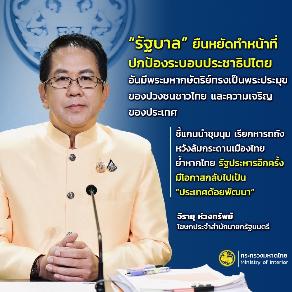 ทั้งนี้ รัฐบาลจะยืนหยัดในการธำรงไว้ซึ่งระบอบประชาธิปไตยอันมีพระมหากษัตริย์ทรงเป็นประมุข และขอเรียกร้องให้องค์กรต่างๆที่ร่วมกันต่อสู้กับการปฏิวัติรัฐประหารได้จับมือประสานกันรณรงค์เพื่อต่อต้านกลุ่มบุคคล ที่เรียกร้องให้ทำการปฏิวัติรัฐประหารเพื่อไม่ให้ประเทศไทยบอบช้ำไปมากกว่านี้ นายจิรายุ กล่าว