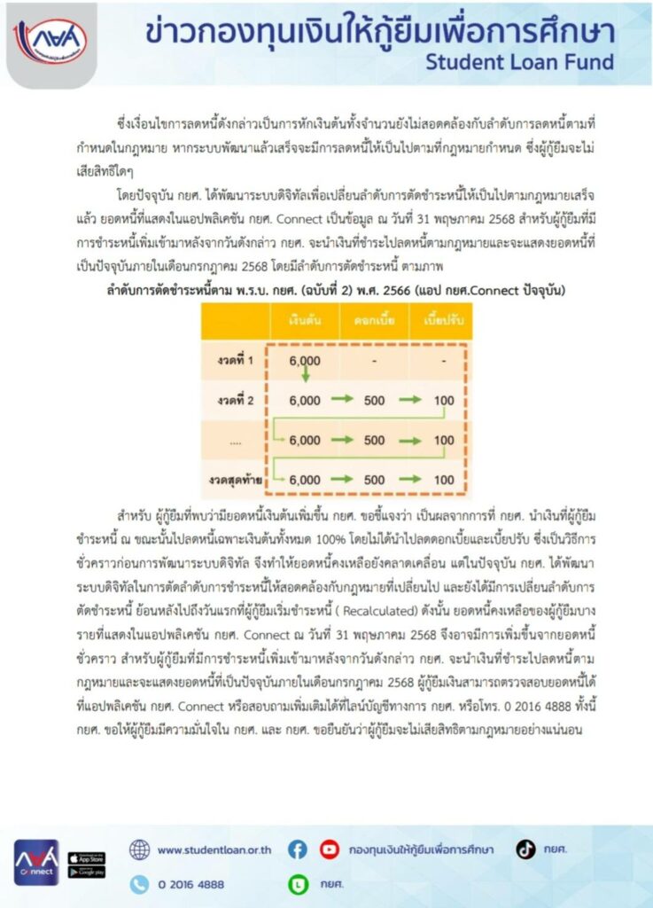 ดังนั้น ยอดหนี้คงเหลือของผู้กู้ยืมบางรายที่แสดงในแอปพลิเคชัน กยศ. Connect ณ วันที่ 31 พฤษภาคม 2568 จึงอาจมีการเพิ่มขึ้นจากยอดหนี้ชั่วคราว สำหรับผู้กู้ยืมที่มีการชำระหนี้เพิ่มเข้ามาหลังจากวันดังกล่าว กยศ. จะนำเงินที่ชำระไปลดหนี้ตามกฎหมายและจะแสดงยอดหนี้ที่เป็นปัจจุบันภายในเดือนกรกฎาคม 2568 ผู้กู้ยืมเงินสามารถตรวจสอบยอดหนี้ได้ที่แอปพลิเคชัน กยศ. Connect หรือสอบถามเพิ่มเติมได้ที่ไลน์บัญชีทางการ กยศ. หรือโทร. 0 2016 4888 ทั้งนี้ กยศ. ขอให้ผู้กู้ยืมมีความมั่นใจใน กยศ. และ กยศ. ขอยืนยันว่าผู้กู้ยืมจะไม่เสียสิทธิตามกฎหมายอย่างแน่นอน