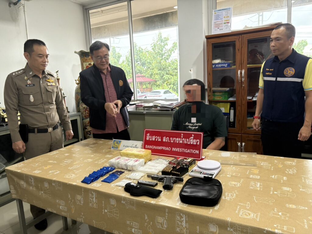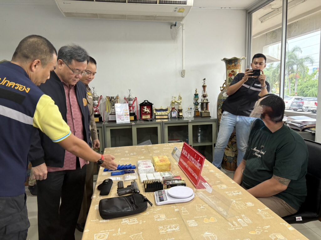 วันที่ 8 กรกฎาคม 2568 เวลา 11.30 น. ที่สถานีตำรวจภูธรอำเภอบางน้ำเปรี้ยว อ.บางน้ำเปรี้ยว จ.ฉะเชิงเทรา นายขจรเกียรติ รักพานิชมณี ผู้ว่าราชการจังหวัดฉะเชิงเทรา พร้อมด้วย นายธีระพล สุ่มมาตย์ นายอำเภอบางน้ำเปรี้ยว และ พ.ต.อ. ณัฐพล อะกะเรือน ผู้กำกับการสถานีตำรวจภูธรอำเภอบางน้ำเปรี้ยว ร่วมกันแถลงผลการจับกุมชายวัย 44 ปี ผู้จัดการบริษัทขนส่งเอกชน (บริษัท เจ แอนด์ ที เอกเพรส จำกัด) คาโกดังแยกสินค้า หลังชุดสืบสวน สภ.บางน้ำเปรี้ยว ขยายผลจนทราบว่าชายคนดังกล่าวแอบลักลอบขายยาบ้าและยาไอซ์ให้กับคนงานในพื้นที่ และมีการแพ็คส่งของให้ลูกค้าตามต่างจังหวัด