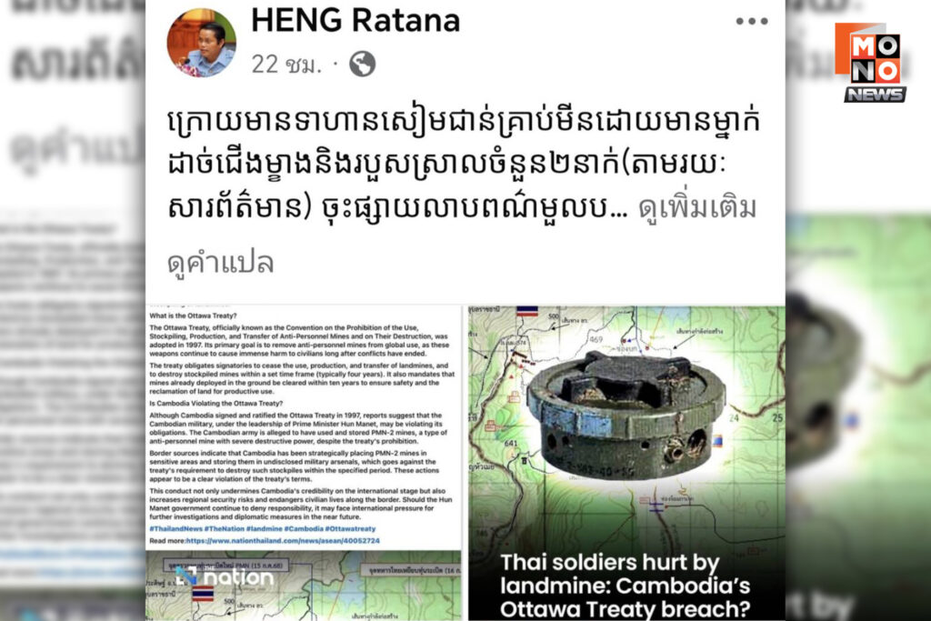 - การที่นายแฮง รัตนา กล่าวว่าทุ่นระเบิดอยู่ในเขตไทย ฝ่ายไทยต้องรับผิดชอบ พร้อมอ้างมาตรา 5 ของอนุสัญญาออตตาวา (Ottawa Treaty) ซึ่งระบุว่า “เจ้าของอธิปไตยเหนือดินแดนต้องเป็นผู้รับผิดชอบ” นั้น ยิ่งสะท้อนว่าทุ่นระเบิดที่พบอยู่ในเขตอธิปไตยของไทย และแสดงถึงการรุกล้ำเข้ามาในเขตแดนไทย ด้วยวิธีการแอบลักลอบข้ามแดนเข้ามาวางทุ่นระเบิดเอาไว้