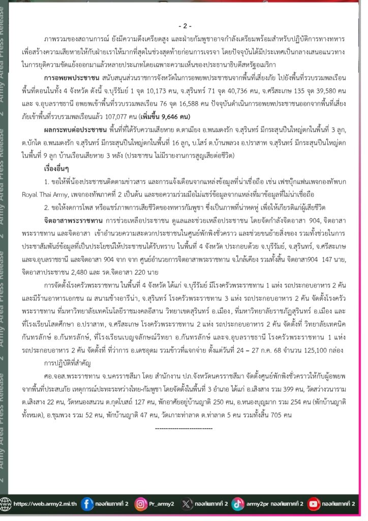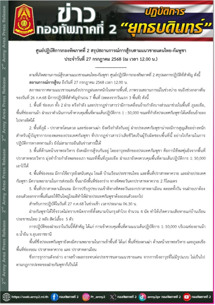 ศูนย์ปฏิบัติการกองทัพภาคที่ 2 สรุปสถานการณ์การสู้รบตามแนวชายแดนไทย-กัมพูชา ประจำวันที่ 27 กรกฎาคม 2568 (ณ เวลา 12.00 น.)