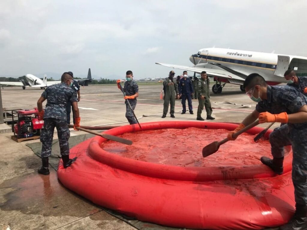 แหล่งข่าวจากกองทัพอากาศ เปิดเผยว่า รูปทหารกำลังผสมสารมีลักษณะสีชมพู มีชื่อว่าสารยับยั้งไฟป่า ทางกองทัพอากาศมีสูตรกองทัพอากาศ 1 ที่ ศูนย์อำนวยการสร้างอาวุธ ศูนย์การอุตสาหกรรมป้องกันประเทศและพลังงานทหาร (ศอว.ศอพท.) ผลิตเอง และ Phos-chek ที่นำเข้ามาเมื่อนานแล้ว