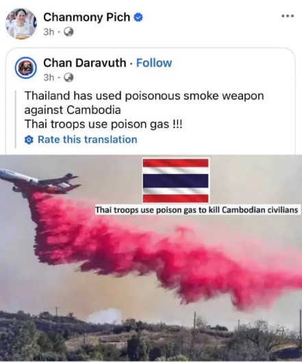 วันที่ 28 กรกฏาคม 2568 จากกรณีที่ พลโทหญิง มาลี โสเจียตา โฆษกกระทรวงกลาโหมกัมพูชา กล่าวหาไทยว่าใช้อาวุธเคมีโจมตีพื้นที่กัมพูชา โดยเฟซบุ๊ก โลก จุมเตียว ดร.ปึช จันทมนนี ฮุน มาแนต ภริยานายกฯกัมพูชา สตรีหมายเลข 1 กัมพูชา แชร์ภาพภารกิจสหรัฐดับไฟป่าแคลิฟอร์เนีย มาอ้างว่าไทยใช้แก๊สพิษ ส่วนภาพที่โพสต์เป็นภาพจากกูเกิ้ล
