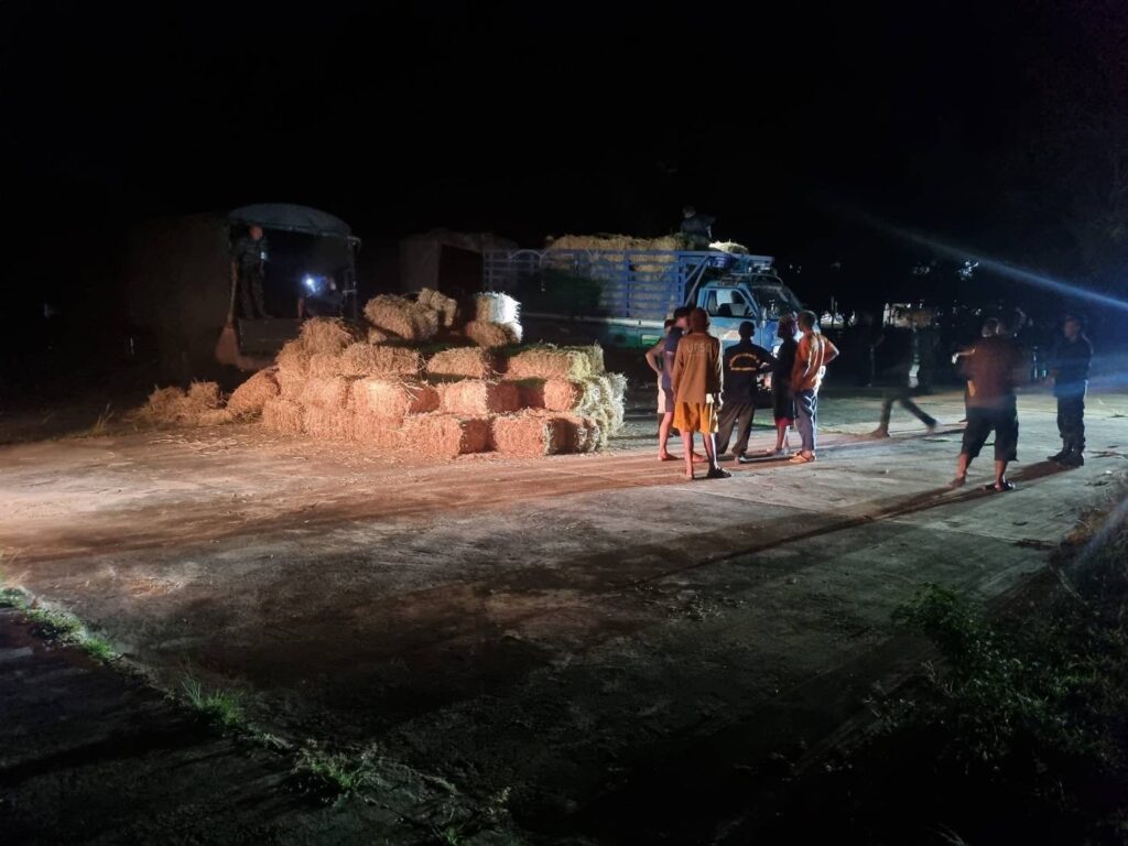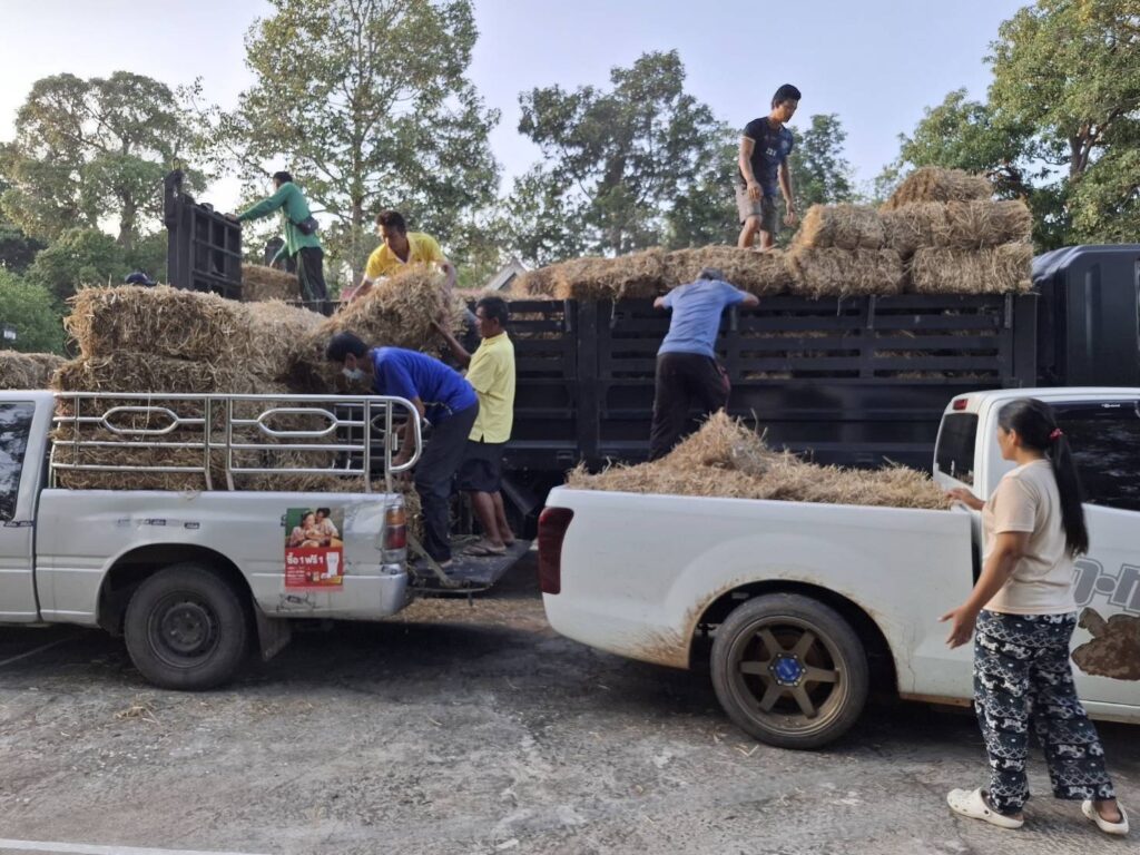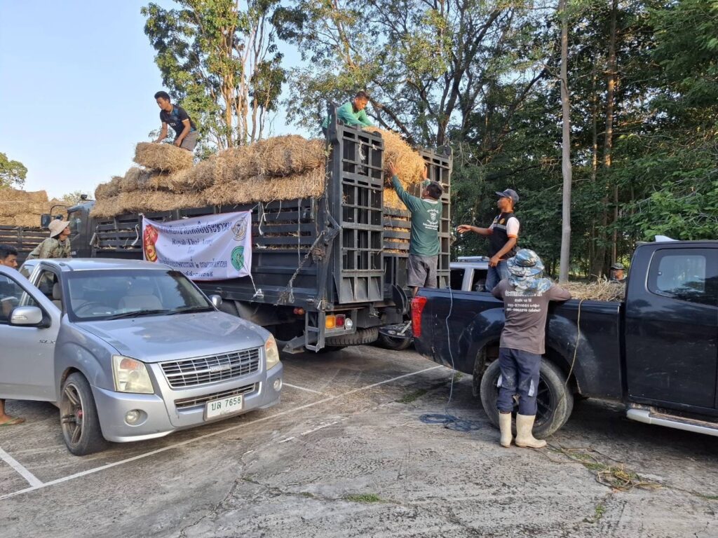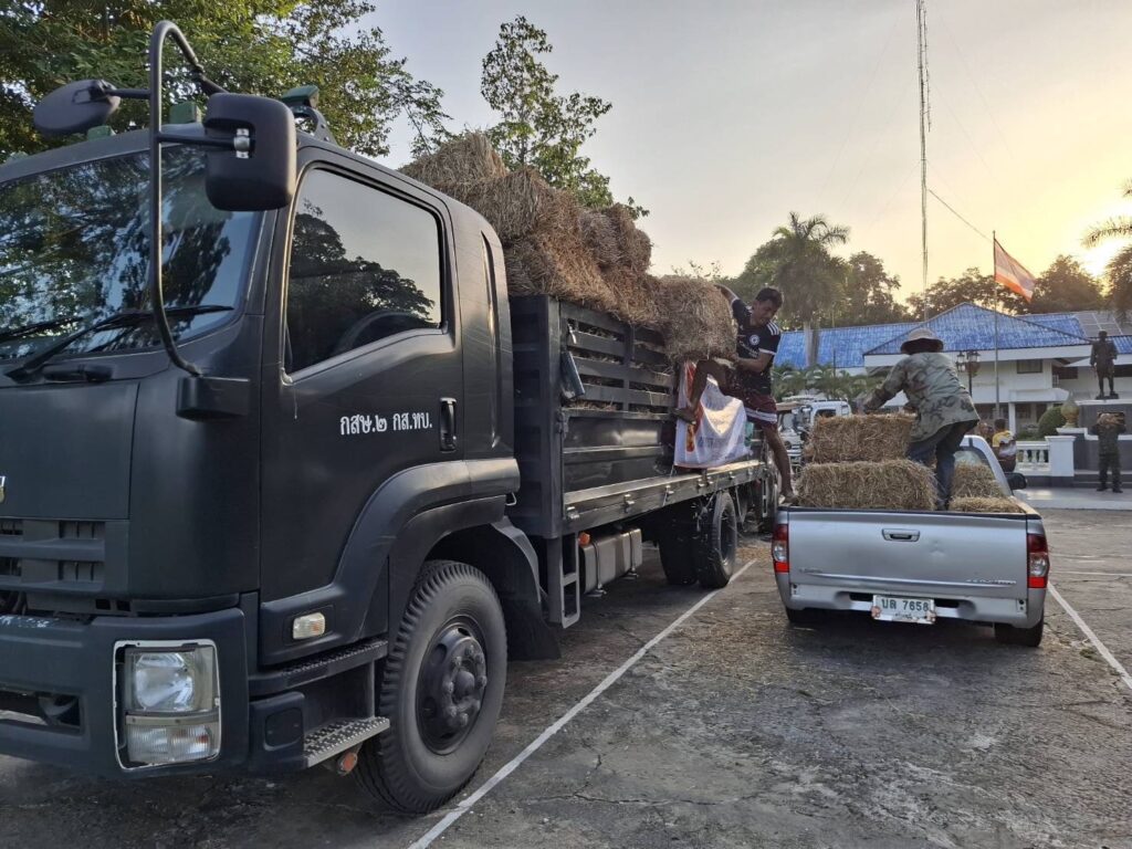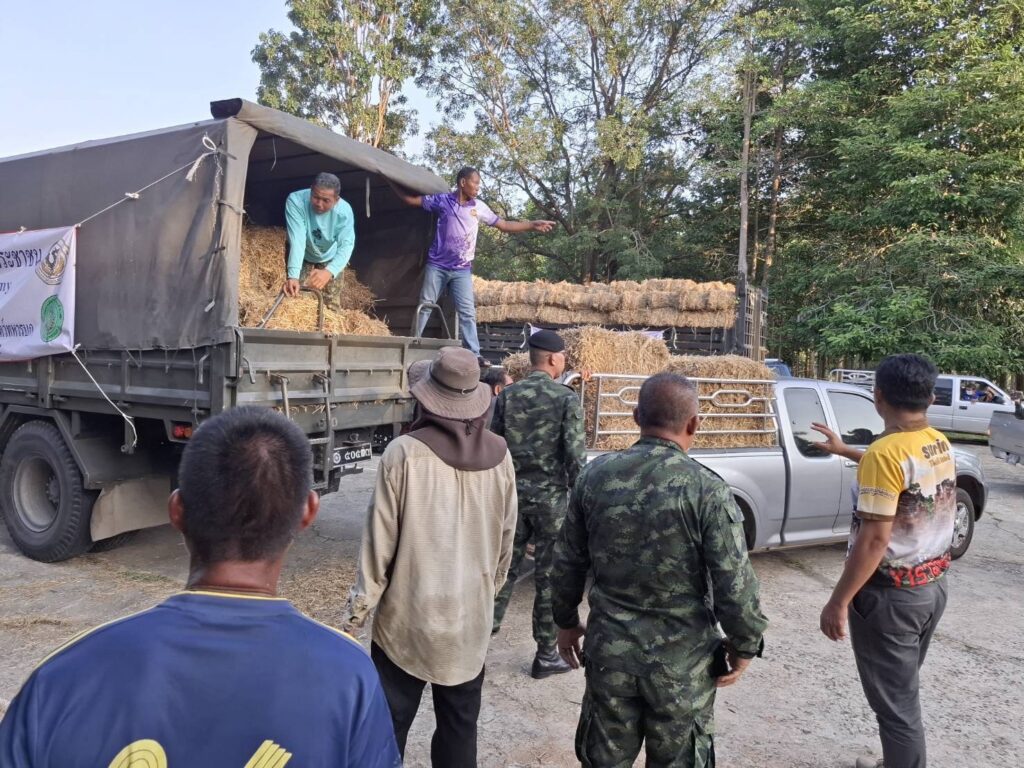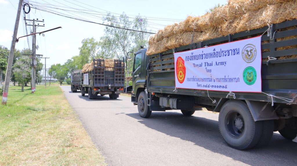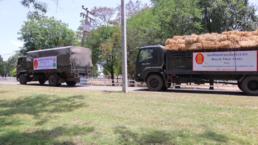 ในการนี้ กรมการสัตว์ทหารบก ร่วมกับ มูลนิธิชัยพัฒนา, กรมปศุสัตว์ และ ศูนย์อำนวยการป้องกันและแก้ไขปัญหาภัยพิบัติด้านปศุสัตว์ ได้สนับสนุนหญ้าฟ่อนแห้งจำนวน 25,000 ฟ่อน เพื่อแจกจ่ายให้แก่เกษตรกรในพื้นที่กองทัพภาคที่ 2 และพื้นที่ใกล้เคียง พร้อมจัดรถบรรทุกลำเลียงอย่างต่อเนื่อง โดยวานนี้ (2 ส.ค.68) กรมการสัตว์ทหารบก ได้ลำเลียงหญ้าฟ่อนแห้งจำนวน 1,100 ฟ่อน จาก อ.ปากช่อง จ.นครราชสีมา ไปยังพื้นที่ อ.พนมดงรัก และ อ.กาบเชิง จ.สุรินทร์