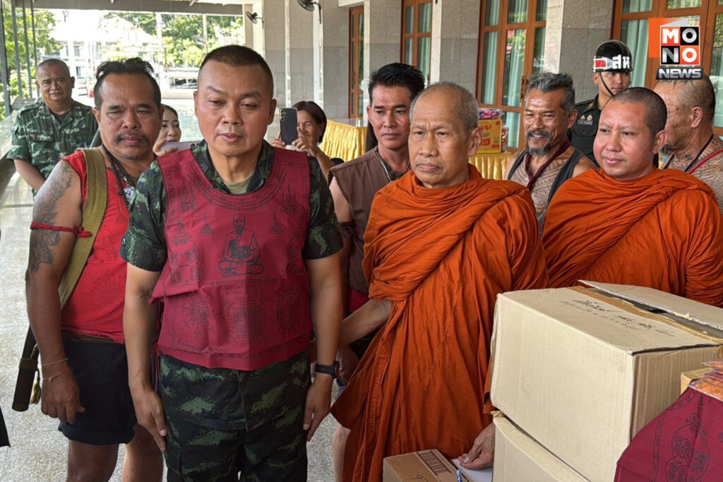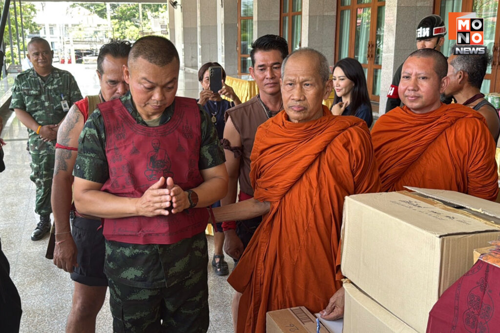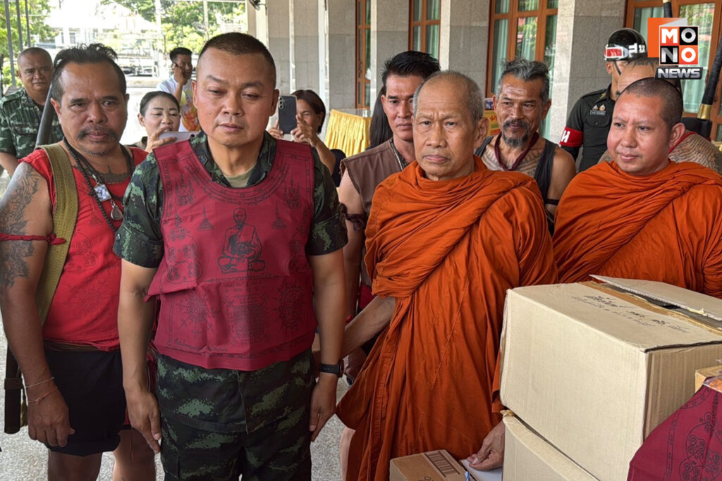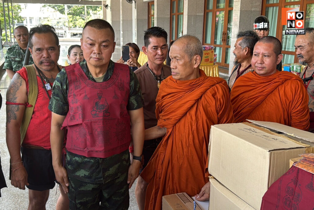 โดยมีพระครูวิชิตวุฒิคุณ เจ้าอาวาสวัดโพธิ์เก้าต้น อำเภอบางระจัน จังหวัดสิงห์บุรี พร้อมด้วยชาวบ้านบางระจันที่แต่งกายชุดไทยย้อนยุคเป็นนักรบโบราณสมัยกรุงศรีอยุธยา กว่า 20 คน นำของใช้จำเป็นรวมถึงเสื้อผ้ายันต์พระอาจารย์ธรรมโชติ จำนวน 500 อัน และผ้าประเจียดลงอาคมอีก 1,500 อัน มอบให้กับพลโทบุญสินเพื่อส่งต่อไปยังทหารแนวหน้าได้มีกำลังใจในการปกป้องชายแดน ซึ่งพลโทบุญสินได้ลองใส่เสื้อเกาะผ้ายันต์พระอาจารย์ธรรมโชติด้วยตนเอง ก่อนจะรับพรจากพระครูวิชิตวุฒิคุณให้แคล้วคลาดปลอดภัย