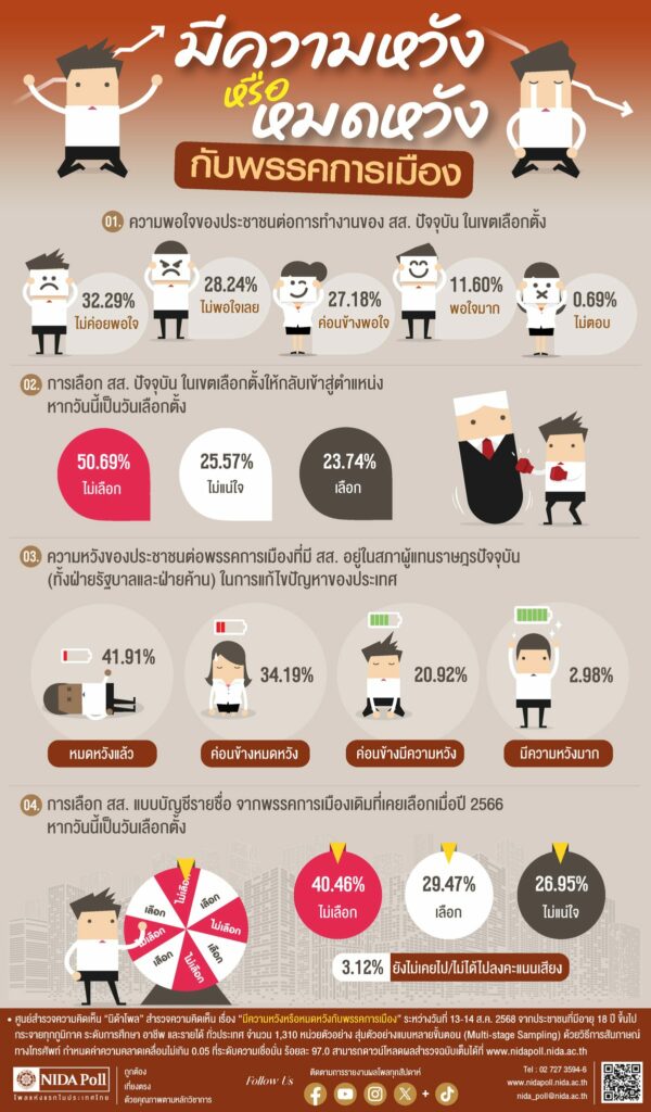 ศูนย์สำรวจความคิดเห็น “นิด้าโพล” สถาบันบัณฑิตพัฒนบริหารศาสตร์ (นิด้า) เปิดเผยผลการสำรวจ เรื่อง “มีความหวังหรือหมดหวังกับพรรคการเมือง” ทำการสำรวจระหว่างวันที่ 13-14 สิงหาคม 2568 จากประชาชนที่มีอายุ 18 ปีขึ้นไป กระจายทุกภูมิภาค ระดับการศึกษา อาชีพ และรายได้ ทั่วประเทศ รวมจำนวนทั้งสิ้น 1,310 หน่วยตัวอย่าง เกี่ยวกับการทำงานของสมาชิกสภาผู้แทนราษฎร (สส.) ปัจจุบัน ในเขตเลือกตั้ง การสำรวจอาศัยการสุ่มตัวอย่างโดยใช้ความน่าจะเป็นจากบัญชีรายชื่อฐานข้อมูลตัวอย่างหลัก (Master Sample) ของ “นิด้าโพล” สุ่มตัวอย่างแบบหลายขั้นตอน (Multi-stage Sampling) เก็บข้อมูลด้วยวิธีการสัมภาษณ์ทางโทรศัพท์ โดยกำหนดค่าความคลาดเคลื่อนไม่เกิน 0.05 ที่ระดับความเชื่อมั่น ร้อยละ 97.0