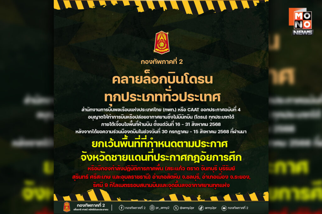 วันที่ 17 สิงหาคม 2568 กองทัพภาคที่ 2 เผยแพร่ประกาศจากสำนักงานการบินพลเรือนแห่งประเทศไทย (กพท.) หรือ CAAT ออกประกาศฉบับที่ 4 อนุญาตให้ทำการบินหรือปล่อยอากาศยานซึ่งไม่มีนักบิน (โดรน) ทุกประเภทได้ ภายใต้เงื่อนไขพื้นที่ห้ามบิน ตั้งแต่วันที่ 16 – 31 สิงหาคม 2568 หลังจากได้ขอความร่วมมืองดบินในช่วงวันที่ 30 กรกฎาคม – 15 สิงหาคม 2568 ที่ผ่านมา ตามที่หน่วยงานด้านความมั่นคงขอความร่วมมือเพื่อป้องกันความเสี่ยงด้านความมั่นคงและความปลอดภัยของประเทศ จากสถานการณ์ความไม่สงบบริเวณชายแดนไทย–กัมพูชา ซึ่งอาจส่งผลกระทบต่อการปฏิบัติงานของเจ้าหน้าที่ฝ่ายความมั่นคงในพื้นที่ต่าง ๆ
