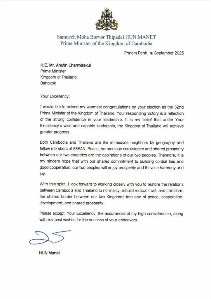 ด้วยเจตนารมณ์ที่กล่าวมา ข้าพเจ้าตั้งตารอที่จะได้ทำงานอย่างใกล้ชิดกับท่าน เพื่อฟื้นฟูความสัมพันธ์ระหว่างกัมพูชาและไทยให้กลับสู่ภาวะปกติ สร้างความไว้วางใจซึ่งกันและกันขึ้นใหม่ และเปลี่ยนแปลงพรมแดนร่วมของสองราชอาณาจักรให้กลายเป็นพื้นที่แห่งสันติภาพ ความร่วมมือ การพัฒนา และความเจริญรุ่งเรืองร่วมกัน