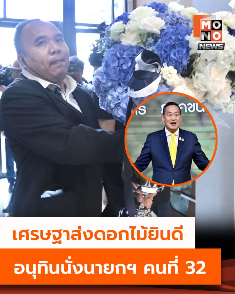 เศรษฐา ทวีสิน อดีตนายกฯ ส่งตัวแทนนำช่อดอกไม้ดอกกุหลาบขาวและไฮเดรนเยียสีน้ำเงิน แสดงความยินดีอนุทิน ชาญวีรกูล หลังโปรดเกล้าฯ แต่งตั้งเป็นนายกรัฐมนตรีคนที่ 32