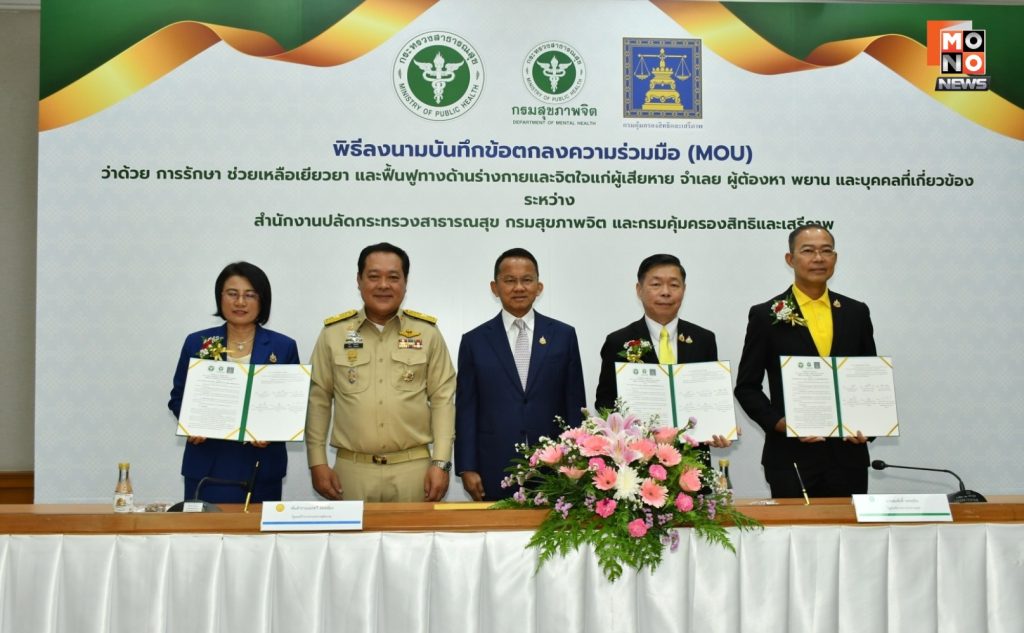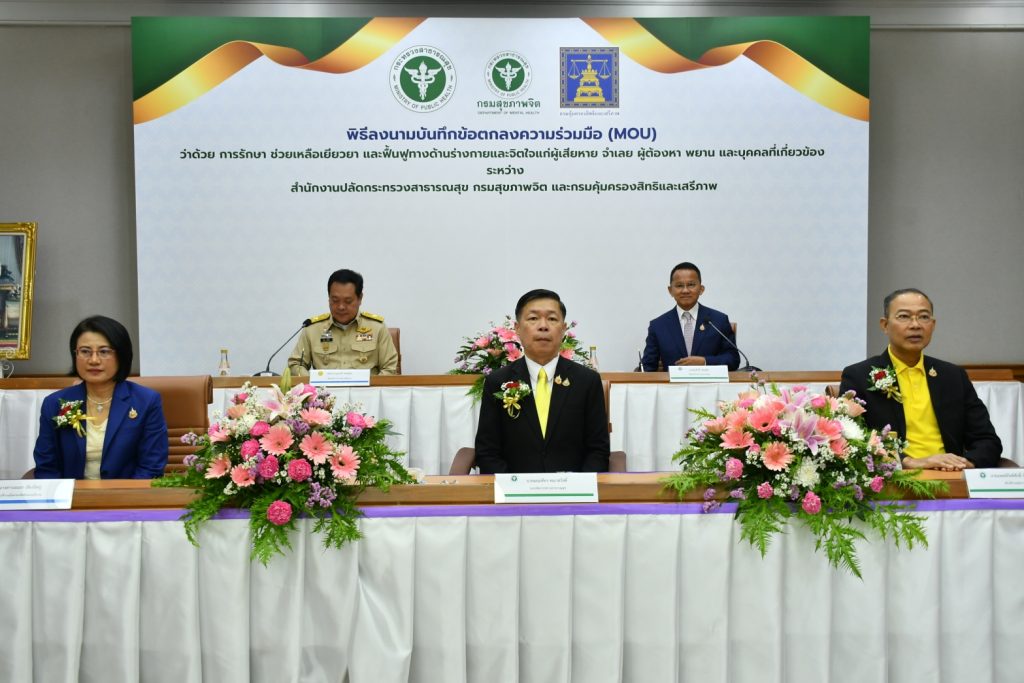 สำนักงานปลัดกระทรวงสาธารณสุข ร่วมกับ กรมสุขภาพจิต กรมคุ้มครองสิทธิและเสรีภาพ ลงนามบันทึกข้อตกลงความร่วมมือ ว่าด้วยการรักษา ช่วยเหลือเยียวยา และฟื้นฟูทางด้านร่างกายและจิตใจแก่ผู้เสียหาย จำเลย ผู้ต้องหา พยาน และบุคคลที่เกี่ยวข้อง ให้เข้าถึงระบบการดูแลทั้งสุขภาพกาย สุขภาพจิต ครอบคลุมความคุ้มครองตามสิทธิขั้นพื้นฐานและกฎหมาย อย่างต่อเนื่องไร้รอยต่อ เท่าเทียมและเป็นธรรม