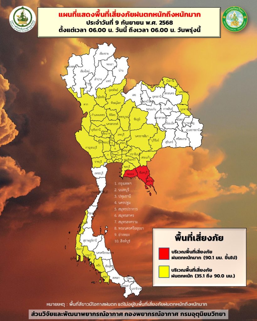 ร่องมรสุมที่พาดผ่านภาคเหนือและภาคตะวันออกเฉียงเหนือตอนบน ประกอบกับมรสุมตะวันตกเฉียงใต้กำลังปานกลางที่ยังคงพัดปกคลุมทะเลอันดามัน ภาคใต้ และอ่าวไทย ส่งผลให้ประเทศไทยมีฝนตกหนักบางแห่ง โดยมีฝนตกหนักมากบางพื้นที่ในภาคตะวันออก บริเวณจังหวัดระยอง จันทบุรี และตราด ขอให้ประชาชนระวังอันตรายจากฝนตกหนักและฝนที่ตกสะสม ซึ่งอาจทำให้เกิดน้ำท่วมขังหรือน้ำรอการระบายในเขตชุมชนเมือง เช่น กรุงเทพมหานครและปริมณฑล รวมถึงอาจเกิดน้ำท่วมฉับพลันและน้ำป่าไหลหลาก โดยเฉพาะในพื้นที่ลาดเชิงเขาใกล้ทางน้ำ