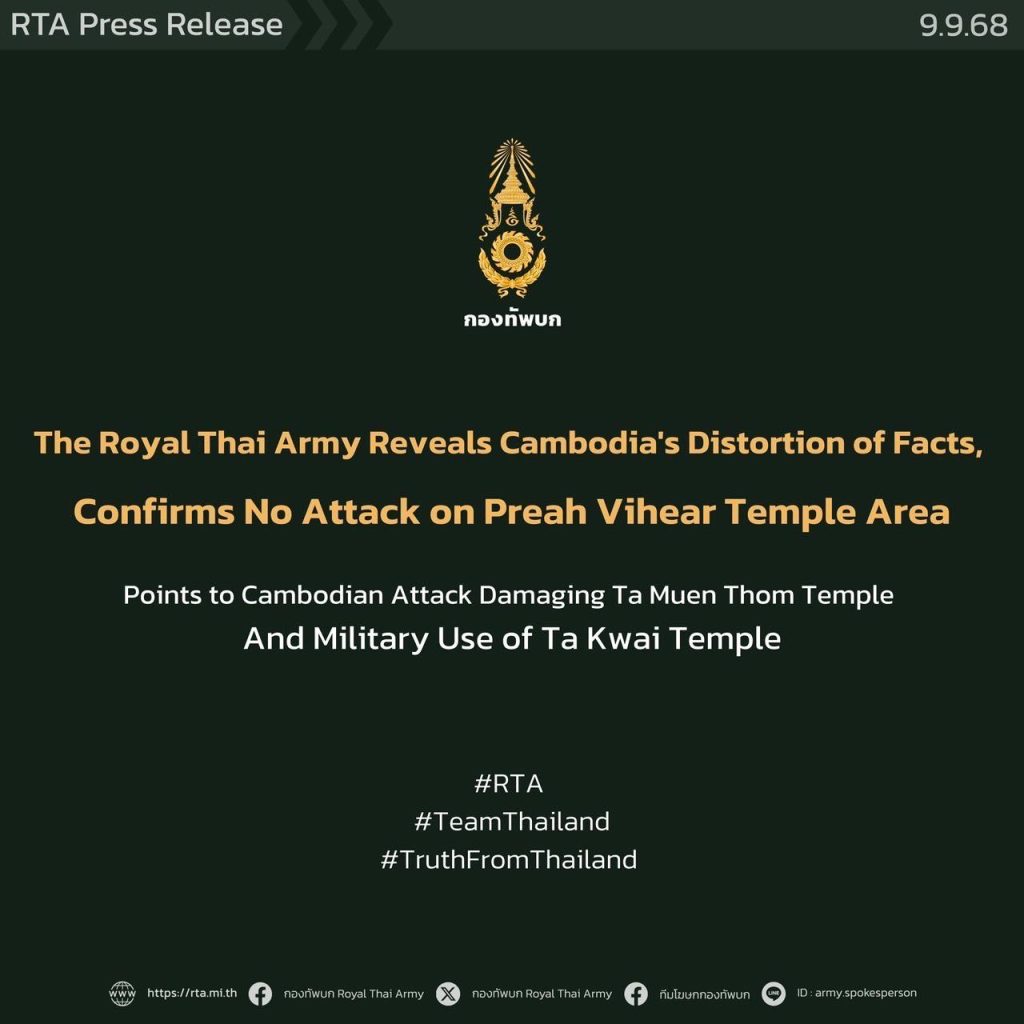 สำหรับรายละเอียดทั้งหมดนี้ เป็นหลักฐานชี้ชัดว่ากัมพูชายังคงพยายามนำเสนอข้อมูลที่บิดเบือนผ่านสื่อมวลชนทั้งในและต่างประเทศ ที่ไม่ตรงกับการกระทำหรือหลักฐานที่ปรากฏ ทั้งยังกล่าวอ้างสร้างผลกระทบต่อประเทศไทย โดยกองทัพบกขอยืนยันถึงความมุ่งมั่นในการดำเนินการอย่างรอบคอบภายใต้หลักมนุษยธรรมและกฎหมายระหว่างประเทศ เพื่อปกป้องอธิปไตยและความมั่นคงของประเทศ โดยมิให้เกิดผลกระทบต่อบุคคลหรือทรัพย์สินที่ไม่มีส่วนเกี่ยวข้องกับสถานการณ์ความขัดแย้งทางทหาร และขอเรียกร้องให้กัมพูชาเสนอข้อมูลและแสดงออกอย่างตรงไปตรงมา เพื่อร่วมแก้ไขปัญหาและดูแลพื้นที่ชายแดนอย่างสันติวิธี