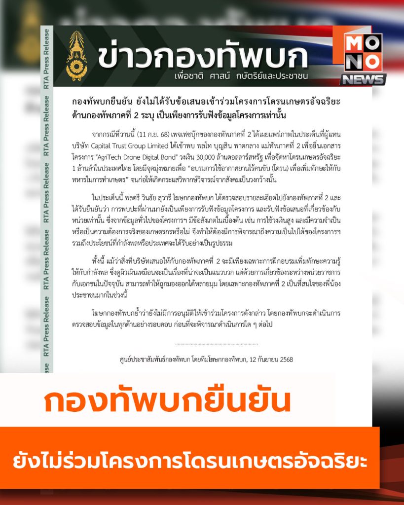 กองทัพบกออกมายืนยันเมื่อวันที่ 12 กันยายน 2568 ว่า ยังไม่มีการอนุมัติหรือเข้าร่วมโครงการจัดหาโดรนเกษตรอัจฉริยะมูลค่า 30,000 ล้านดอลลาร์สหรัฐ ที่ถูกนำเสนอโดยบริษัท Capital Trust Group Limited หลังเกิดกระแสวิพากษ์วิจารณ์ในสังคม ภายหลังเพจเฟซบุ๊กกองทัพภาคที่ 2 เผยแพร่ภาพการเข้าพบของผู้แทนบริษัทต่อ พลโท บุญสิน พาดกลาง แม่ทัพภาคที่ 2 เมื่อวันที่ 11 กันยายนที่ผ่านมา
