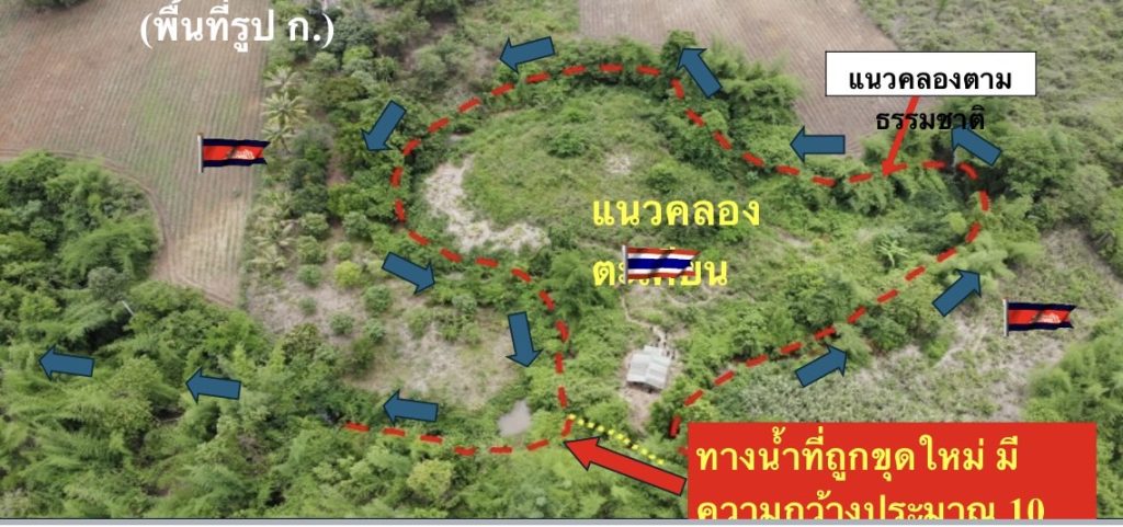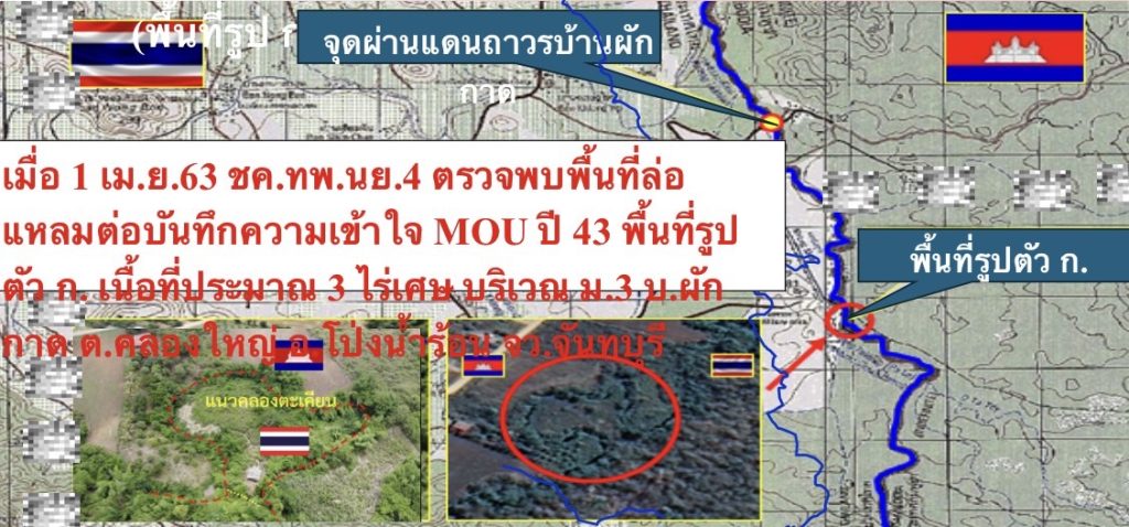 และจุดที่ 3 เป็นกองร้อย ลว.ที่ 1 ของ พัน.ปชด.501 ของกัมพูชา ซึ่งมีแนวคูเรตล้ำเข้ามาในพื้นที่อ้างสิทธิ์ของประเทศไทย ประมาณ 30 เมตร