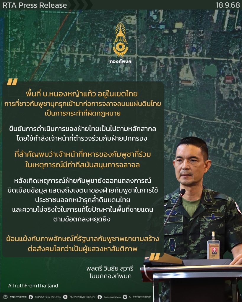 ทั้งนี้ โฆษกกองทัพบกได้ย้ำว่า พื้นที่ดังกล่าวอยู่ในเขตไทย การที่ชาวกัมพูชาบุกรุกเข้ามาทำลายสิ่งของทางราชการ และก่อการจลาจลบนแผ่นดินไทย เป็นการกระทำที่ผิดกฎหมาย จึงต้องถูกดำเนินการตามกระบวนการ และยืนยันการดำเนินการของฝ่ายไทยเป็นไปตามขั้นตอนตั้งแต่การเจรจา แจ้งเตือน และควบคุมการจลาจลตามหลักสากลโดยใช้กำลังเจ้าหน้าที่ตำรวจร่วมกับฝ่ายปกครอง ที่สำคัญพบว่าเจ้าหน้าที่ทหารของกัมพูชาที่ร่วมในเหตุการณ์กลับไม่ห้ามปราม และมีท่าทีสนับสนุนการจลาจล นอกจากนี้หลังเกิดเหตุการณ์ฝ่ายกัมพูชายังออกแถลงการณ์บิดเบือนข้อมูล ทั้งหมดนี้แสดงถึงเจตนาของฝ่ายกัมพูชาในการใช้ประชาชนออกหน้าในการรุกล้ำดินแดนไทย และความไม่จริงใจในการแก้ไขปัญหาในพื้นที่ชายแดนตามข้อตกลงหยุดยิง ย้อนแย้งกับภาพลักษณ์ที่รัฐบาลกัมพูชาพยายามสร้างต่อสังคมโลกว่าเป็นผู้แสวงหาสันติภาพ