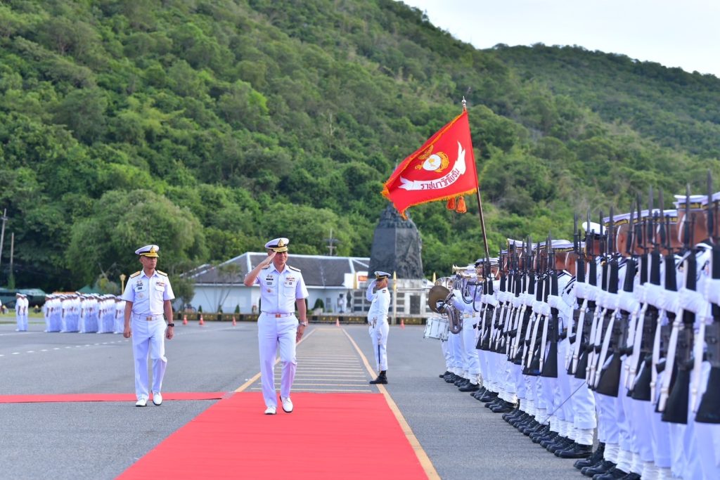 โอกาสนี้ ผู้บัญชาการทหารเรือ ได้ตรวจแถวกองทหารเกียรติยศ ก่อนเข้าร่วมพิธี โดยผู้บัญชาการหน่วยบัญชาการนาวิกโยธิน ได้กล่าวเทิดเกียรติผู้บัญชาการทหารเรือ จากนั้น ผู้บัญชาการทหารเรือ ได้กล่าวขอบคุณ และอำลาหน่วย โดยหน่วยบัญชาการนาวิกโยธิน ได้จัดให้มีพิธีการเชิญธงลงและพิธีย่ำพระสุริย์ศรี เพื่อเป็นเกียรติแก่ผู้บัญชาการทหารเรือ