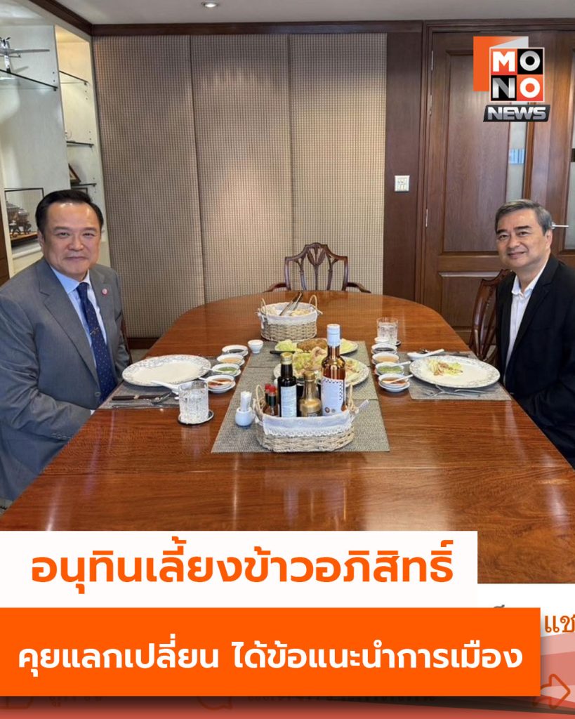 เมื่อวันที่ 19 กันยายน ผู้สื่อข่าวรายงานว่า นายอนุทิน ชาญวีรกูล นายกรัฐมนตรี เปิดเผยความเคลื่อนไหวผ่านเฟซบุ๊กส่วนตัว ภายหลังการพบปะกับนายอภิสิทธิ์ เวชชาชีวะ อดีตหัวหน้าพรรคประชาธิปัตย์ โดยทั้งสองได้พูดคุยหารือและรับประทานอาหารกลางวันร่วมกันที่บริษัท ซิโน-ไทย เอ็นจีเนียริ่ง แอนด์ คอนสตรัคชั่น จำกัด (มหาชน) หรือ STEC