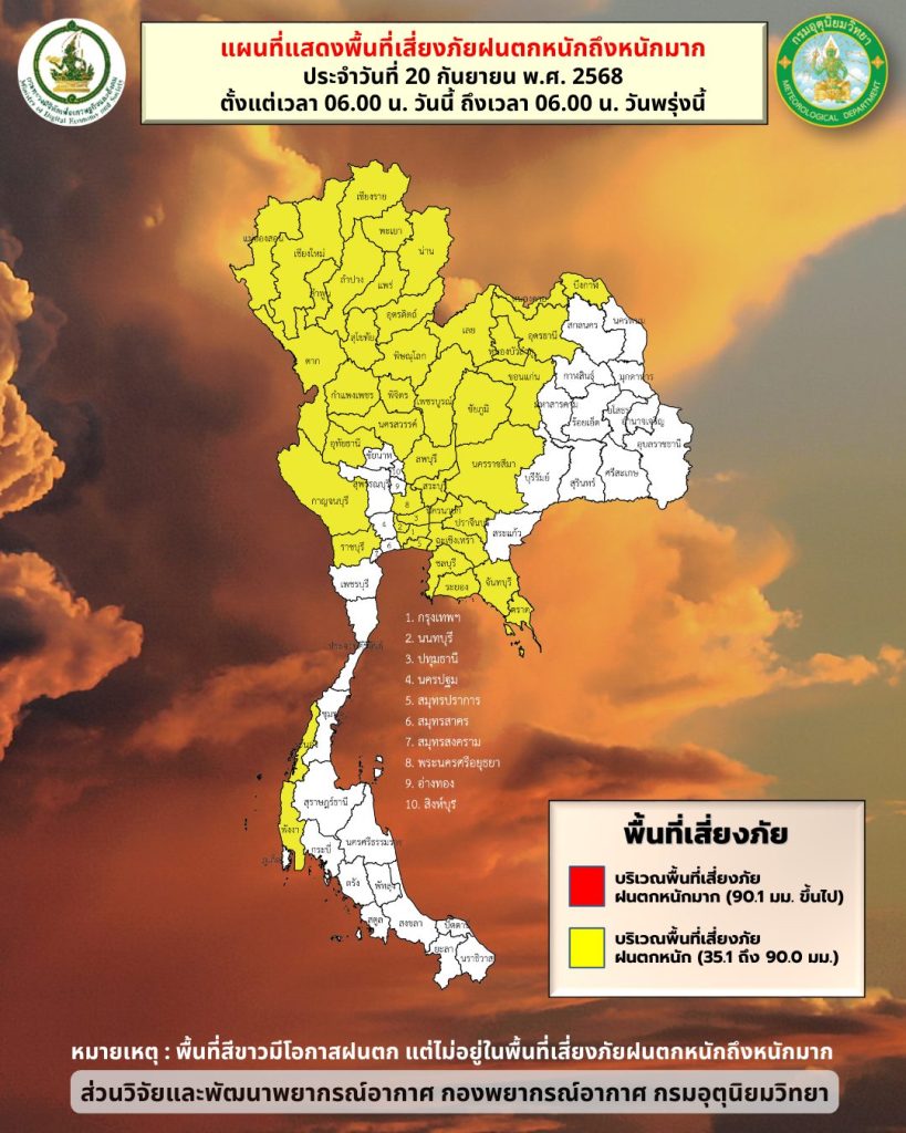 ร่องมรสุมที่พาดผ่านภาคกลางและภาคตะวันออกเฉียงเหนือ ประกอบกับมรสุมตะวันตกเฉียงใต้กำลังปานกลางที่พัดปกคลุมทะเลอันดามัน ประเทศไทย และอ่าวไทย ส่งผลให้ประเทศไทยยังคงมีฝนตกหนักบางแห่ง โดยเฉพาะในบริเวณจังหวัดตาก พิษณุโลก เพชรบูรณ์ เลย ชัยภูมิ นครนายก ปราจีนบุรี จันทบุรี และตราด ขอให้ประชาชนระวังอันตรายจากฝนตกและฝนที่ตกสะสม ซึ่งอาจทำให้เกิดน้ำท่วมฉับพลันและน้ำป่าไหลหลากได้